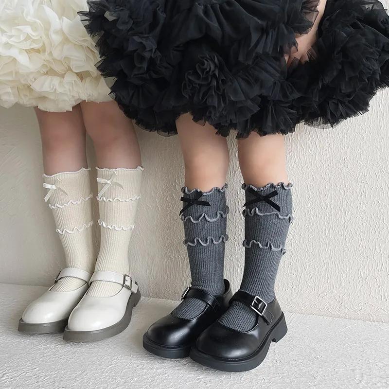 1 пара шикарных осенних носков для девочек из телячьей шерсти, корейские модные носки с оборками и бантом для детей, мягкие хлопковые школьные носки, одежда, аксессуары