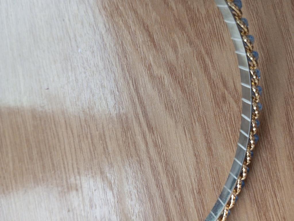 На обруче золотая цепочка с насечками, бусины привязаны леской, соответствует фото продавца. Красиво, Спасибо 👍🥰