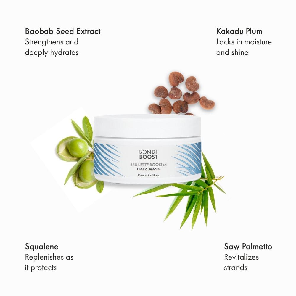 Bondi Boost Брюнетка-бустер для волос. Еженедельная процедура, которая глубоко кондиционирует волосы с помощью темно-синих пигментов и мощных активных веществ, которые устраняют медные оттенки и оживляют волосы.