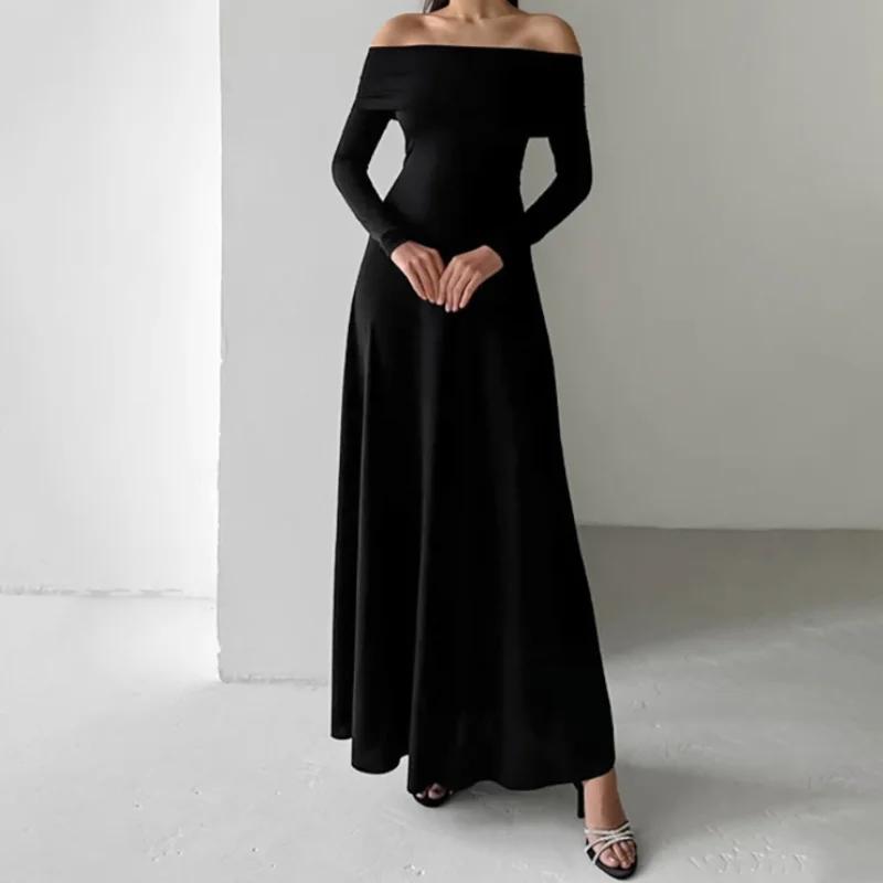 Осень-зима женское сексуальное платье макси с открытыми плечами, однотонное черное платье без бретелек с длинным рукавом для женщин, вечерние платья