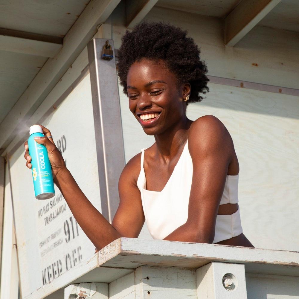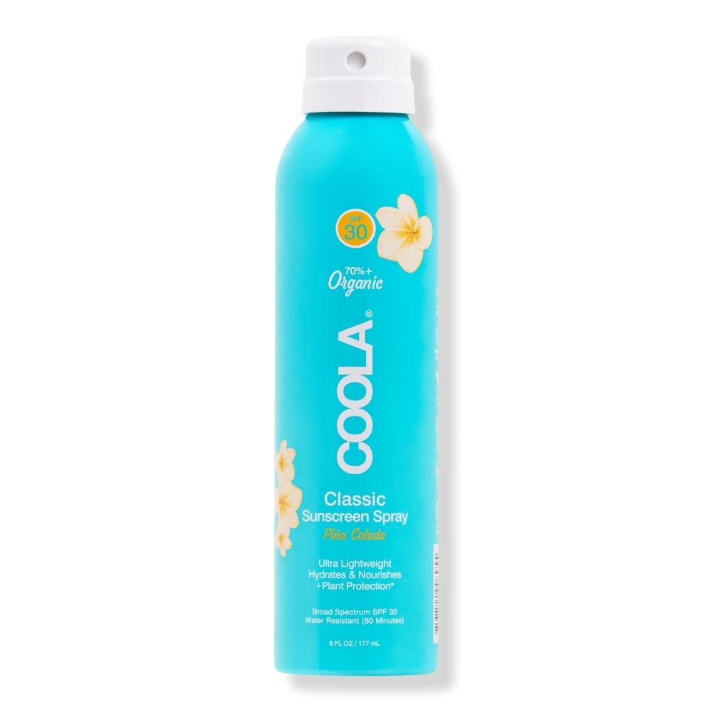 COOLA's continuous non-aerosol, water-resistant sunscreen spray with broad spectrum UVA/UVB protection, anti-aging benefits, and a Piña Colada scent.