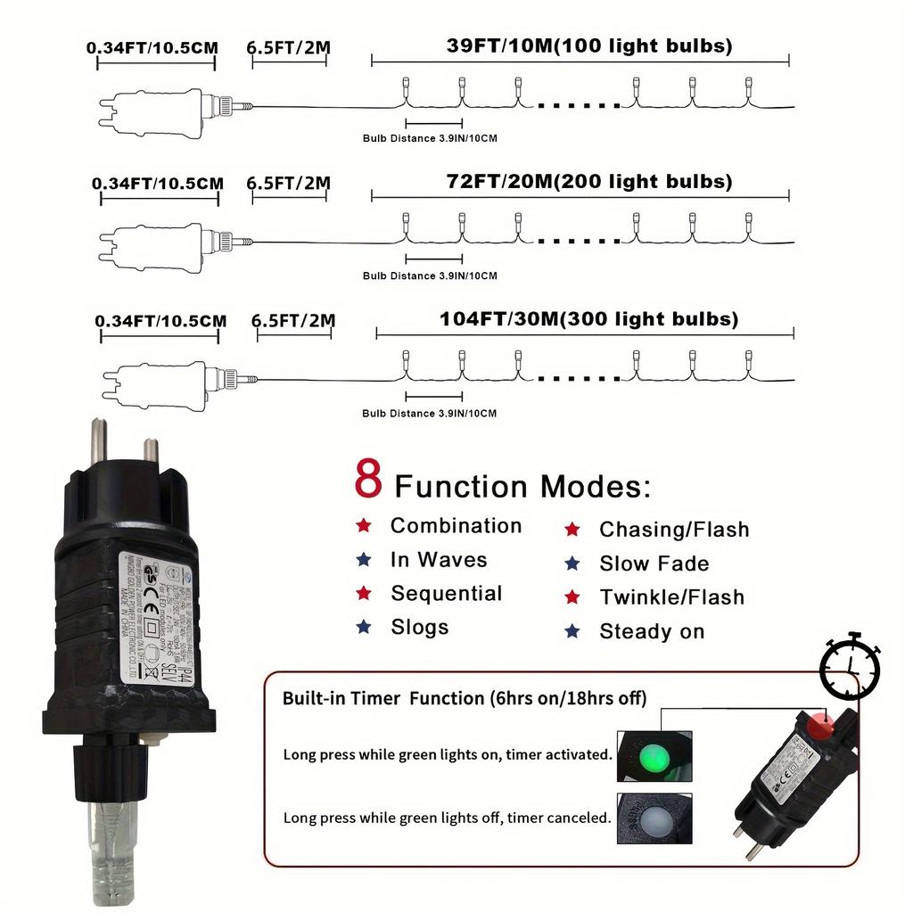 Рождественские гирлянды на 100/200/300 светодиодов для использования в помещении и на открытом воздухе, 8 режимов освещения со встроенными функциями таймера и памяти, водонепроницаемая гирлянда с разъемом