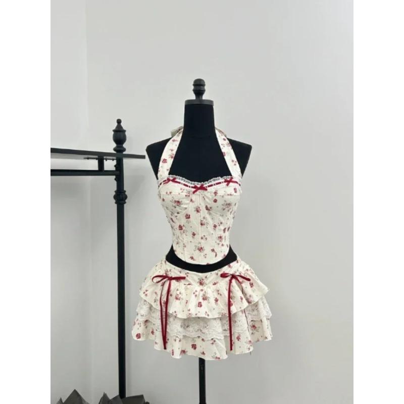 2024 Летний пляжный сказочный отпуск 2000-х годов, наряды для женщин, элегантный комплект из 2 предметов, топы Gyaru Coquette Lace Halter + мини-юбка Y2k