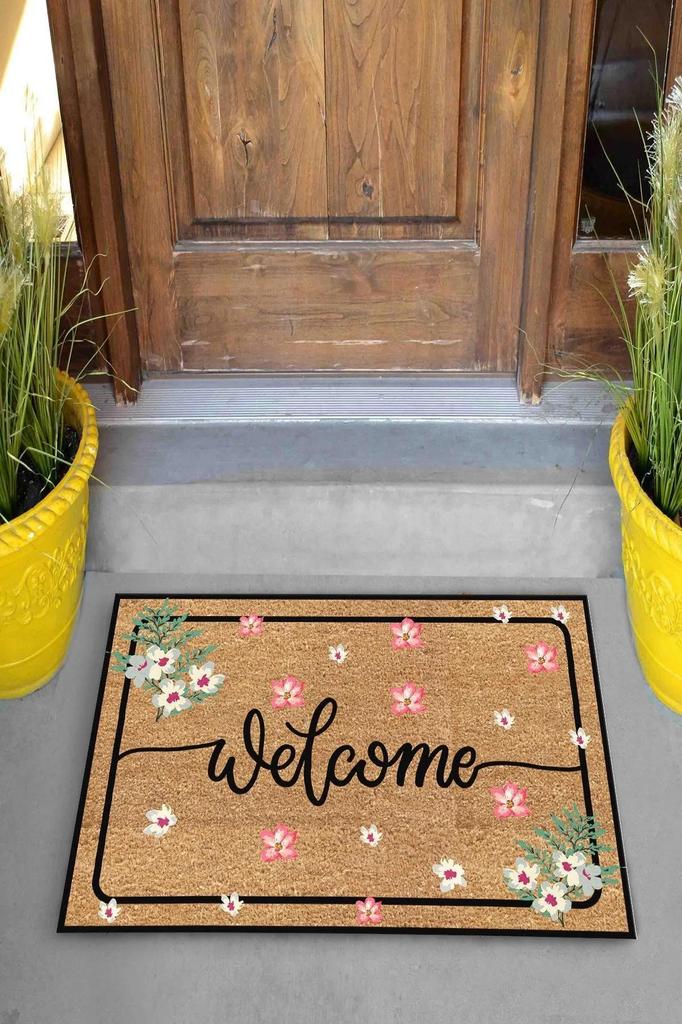 Dekoratif Kapı Önü Paspası Welcome Pembe Çiçek