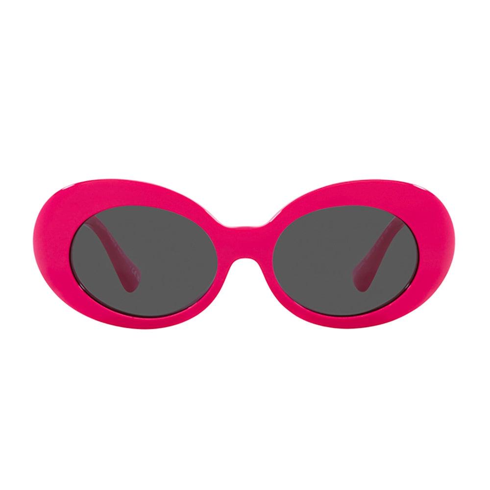These women's oval sunglasses feature a vibrant fuchsia frame and grey lenses. Equipped with UV protection, they provide stylish appearance while safeguarding your eyes. The sunglasses include a Versace box, case, cloth, and paperwork (may vary from picture).