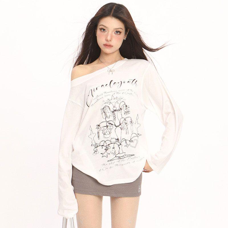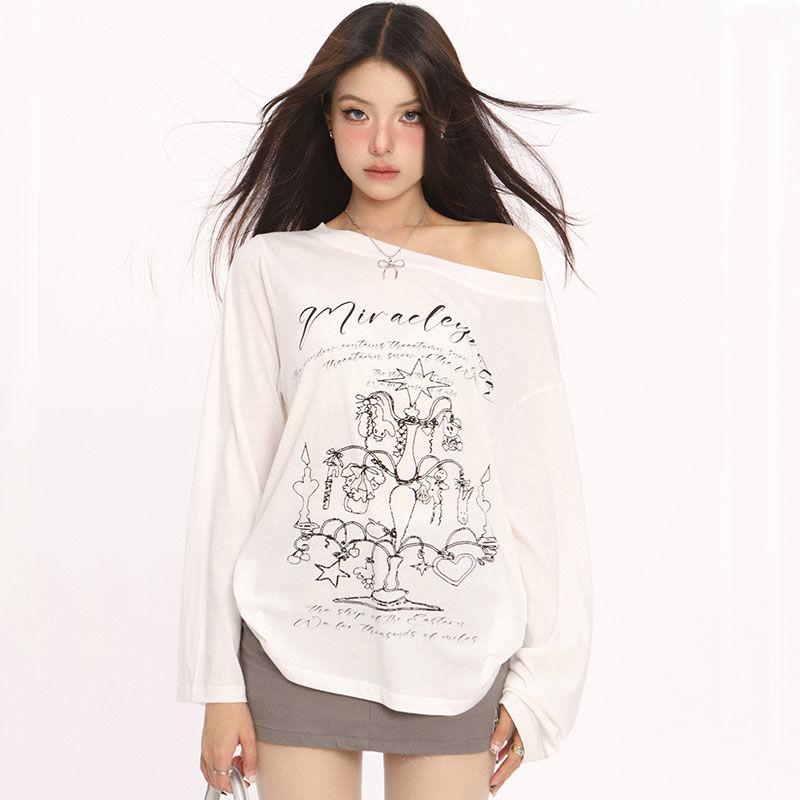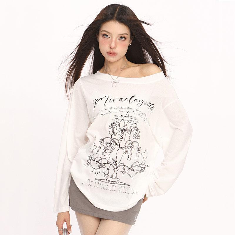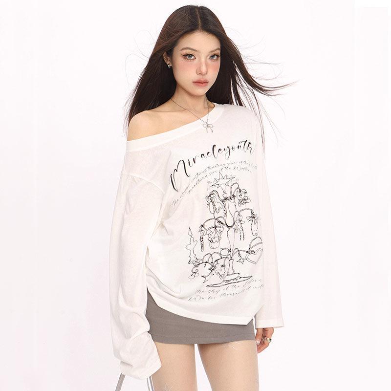 Футболка с открытыми плечами в корейском стиле с граффити, солнцезащитный чехол для лета, свободный новый стиль, ленивый принт, длинный рукав, тонкий топ с кондиционером