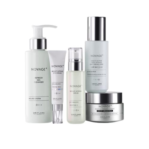 Ритуал Novage+ Bright Intense содержит 5 полноразмерных продуктов с клинически доказанными антипигментирующими, укрепляющими и разглаживающими свойствами, которые улучшают внешний вид кожи.