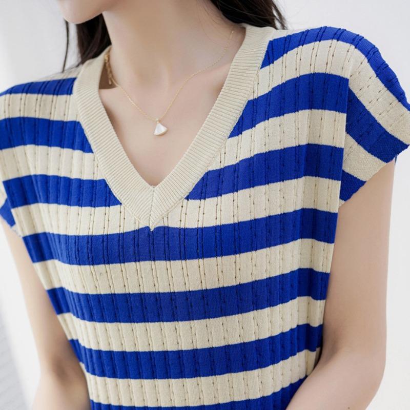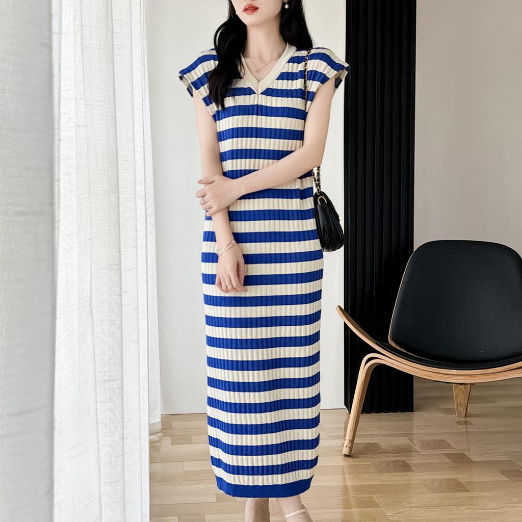 Женская мода лето весна полосатый принт V-образный вырез тонкий повседневные платья