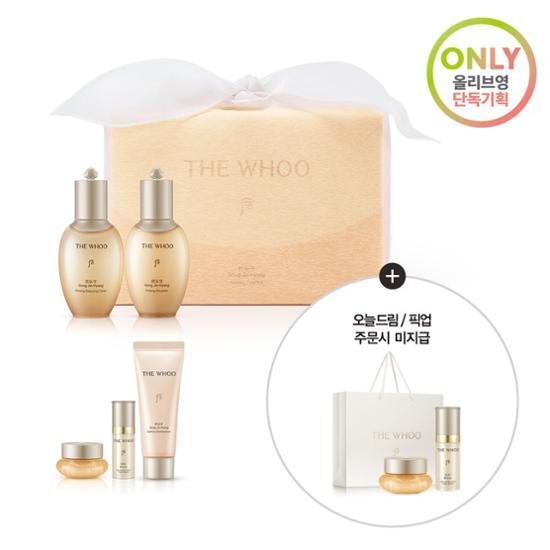 Объем или вес содержимого : [Основной продукт] Балансирующий тоник Gongjinhyang Elasticity 50 мл, Эмульсия Gongjinhyang Elasticity 50 мл [Раздача] Крем Gongjinhyang Elasticity 10 мл, Эссенция Bichup Jaseng 10 мл, Очищающая пенка Gongjinhyang 40 мл