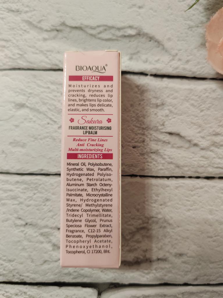 Бальзам для губ от BIOAQUA с ароматом сакуры Бальзам имеет очень приятный едва уловимый цветочный аромат. На губах помадка прозрачная, достаточно жирненькая, губы хорошо питает, но без ощущения липкости. Прекрасно защищает губы от обветривания. Упаковка блистерная, состав указан на упаковке. Бальзам выглядит эстетично. Объём -- 2,7 г. Мне очень нравится бальзамчик, даже превзошёл все мои ожидания. Обязательно буду заказывать ещё. Рекомендую от всей души! Спасибо продавцу! ❤️ Спасибо Джум! ❤️