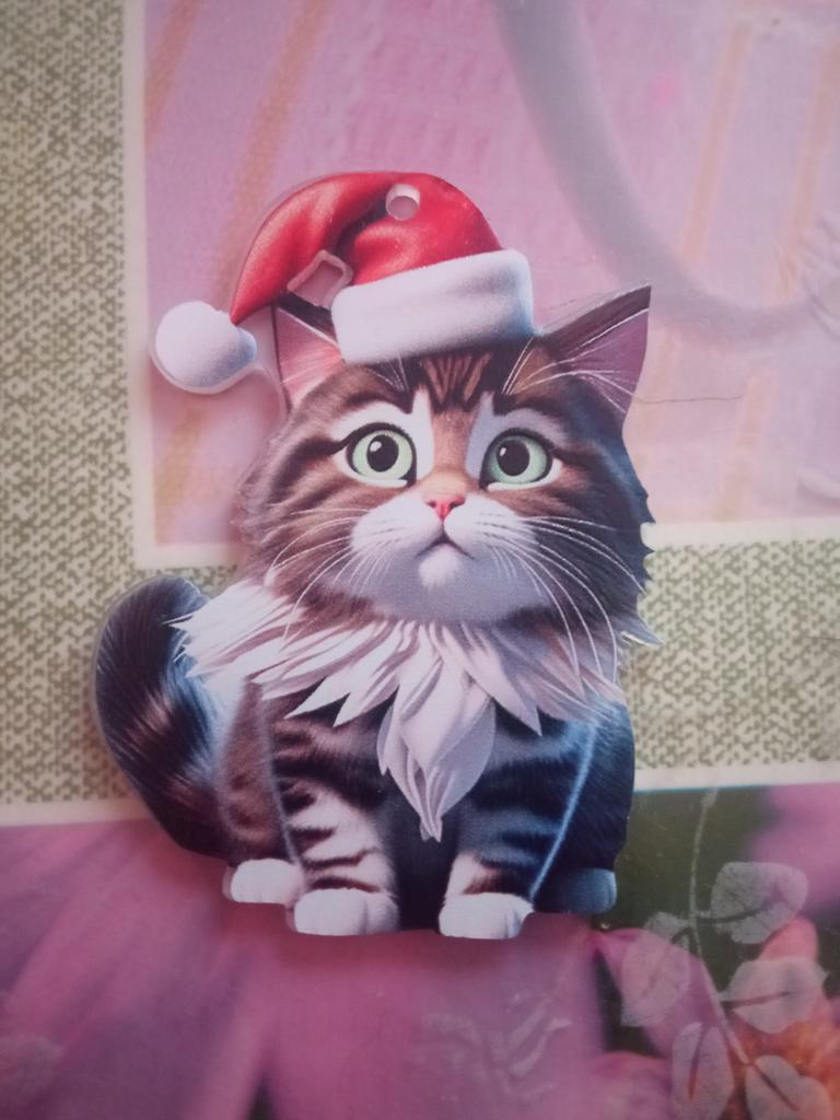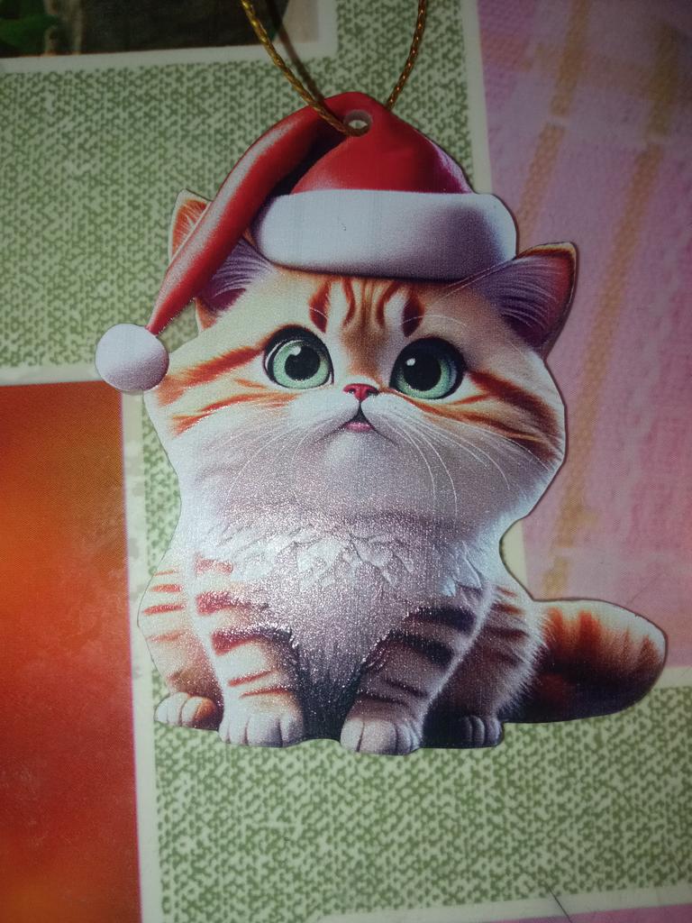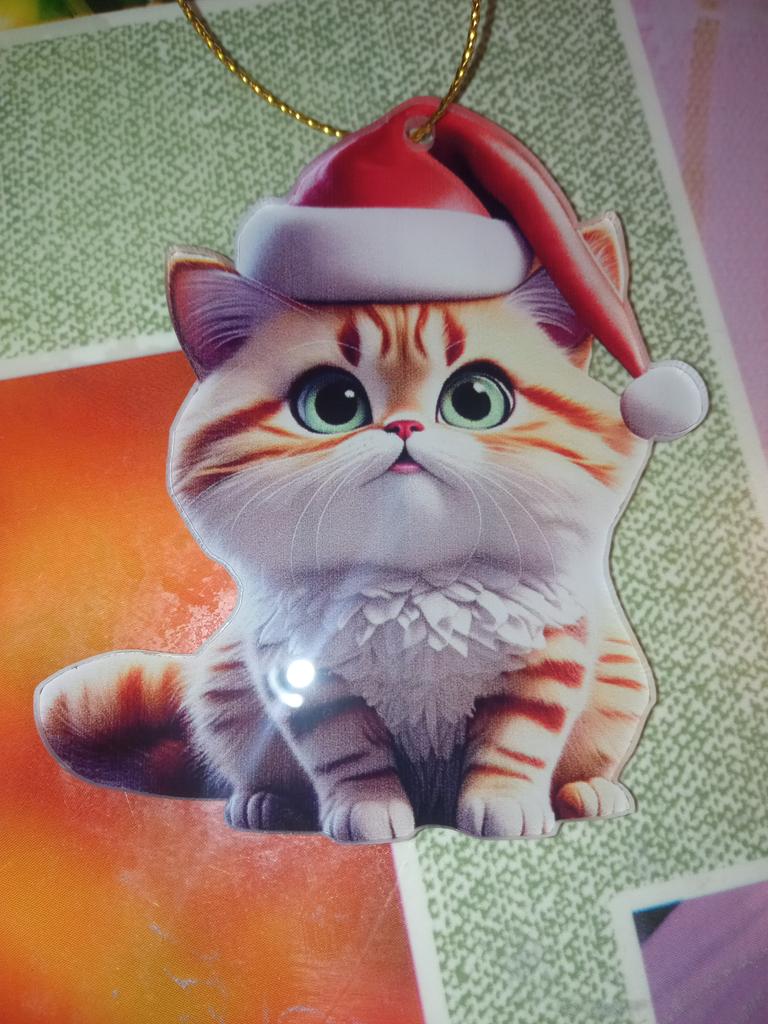Хорошенькая акриловая фигурка - рождественский котик🐈 в колпаке, сделана неплохо, плоская, без повреждений, продавцу спасибо🤗, рекомендую🥰 На выбор несколько вариантов. Фигурка будет смотреться ярче, если с прозрачной стороны снять защитную плёнку. С плёнкой выглядит как будто поцарапанной, так что её обязательно нужно снять, чтобы придать игрушке красивый вид