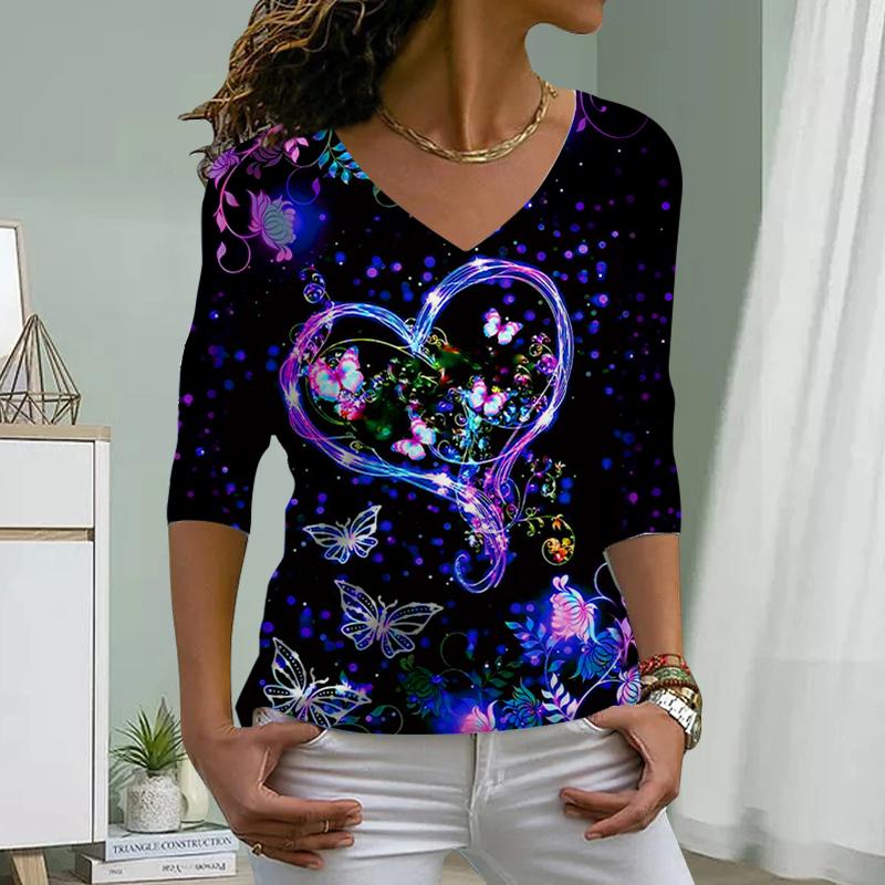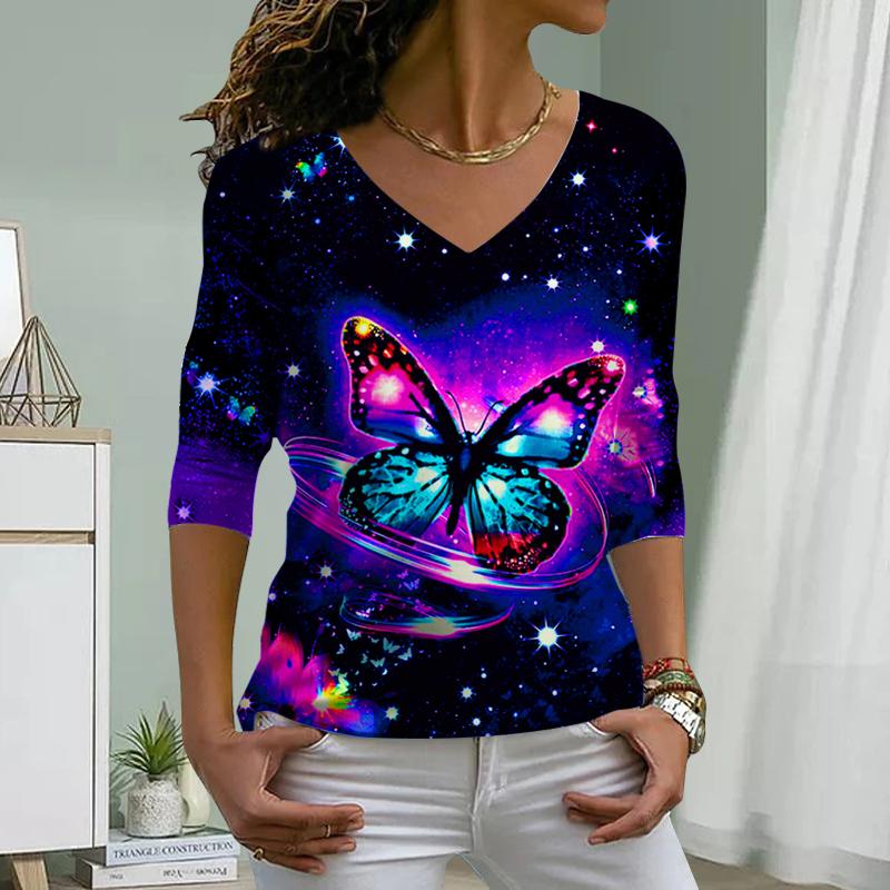 Красочные светящиеся бабочки принт женские футболки женские топы с длинным рукавом V-образный вырез пуловер женские футболки футболка для женщин