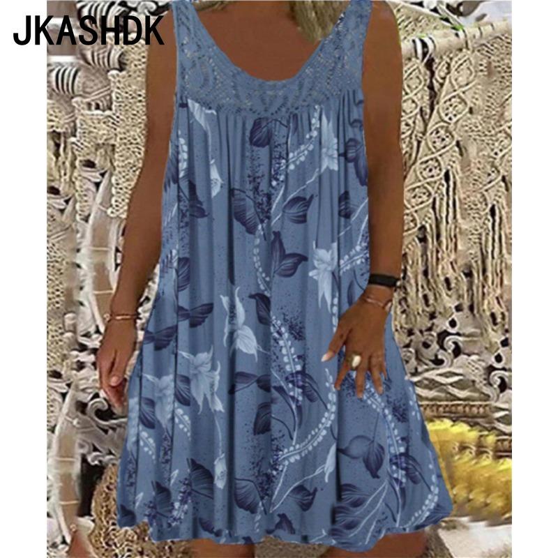 JKASHDK Женская мода лето весна перо принт без рукавов U-образный вырез свободная талия повседневные платья