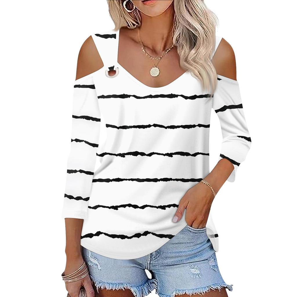 Женская повседневная рубашка-блузка с v-образным вырезом и принтом, сексуальный топ с открытыми плечами и рукавами 3/4