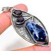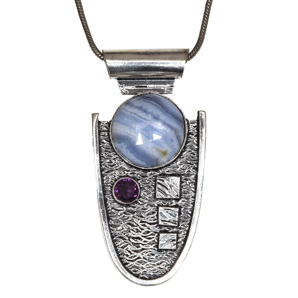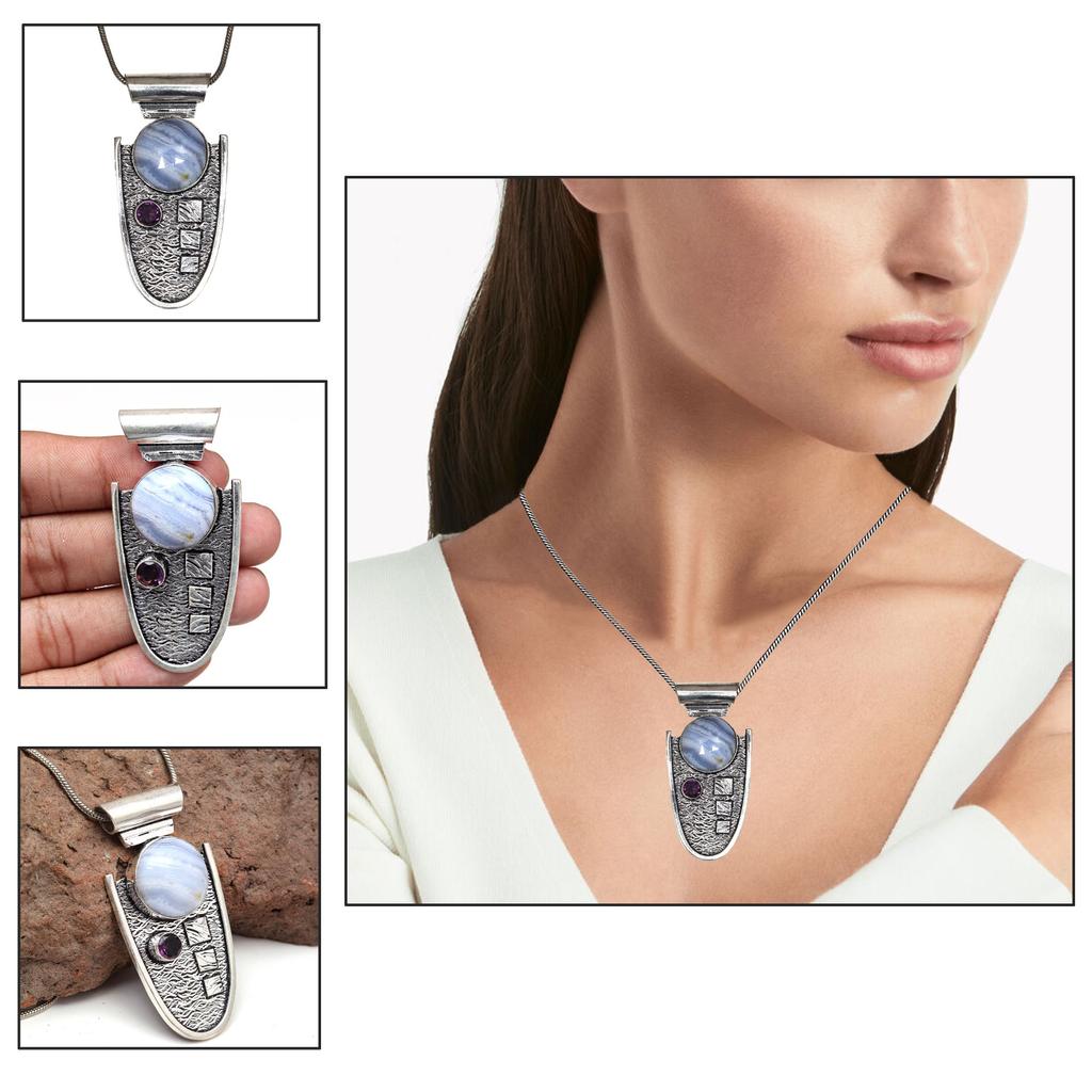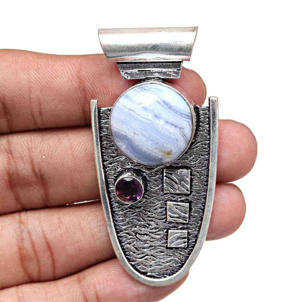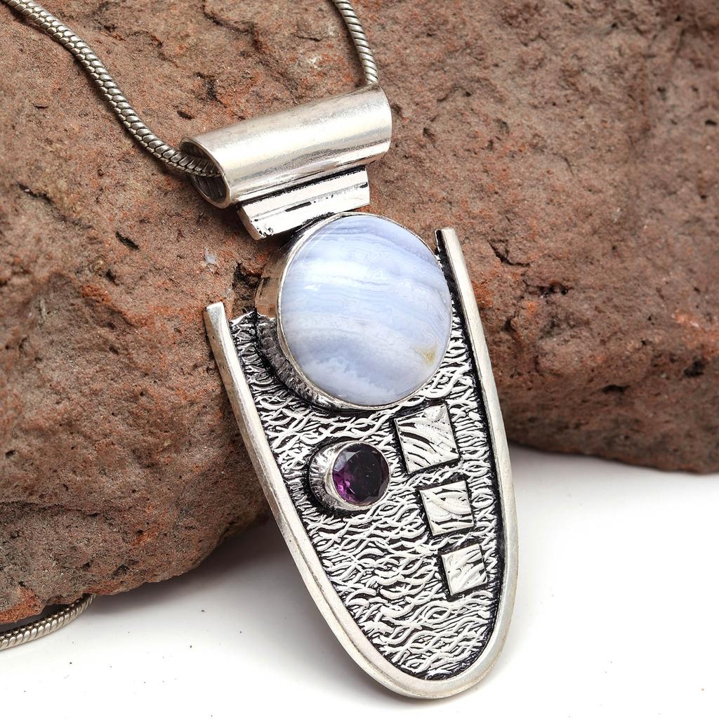 Голубой кружевной агат Аметист Драгоценный камень День матери Серебряное ювелирное изделие Кулон 2.5"