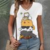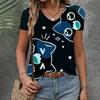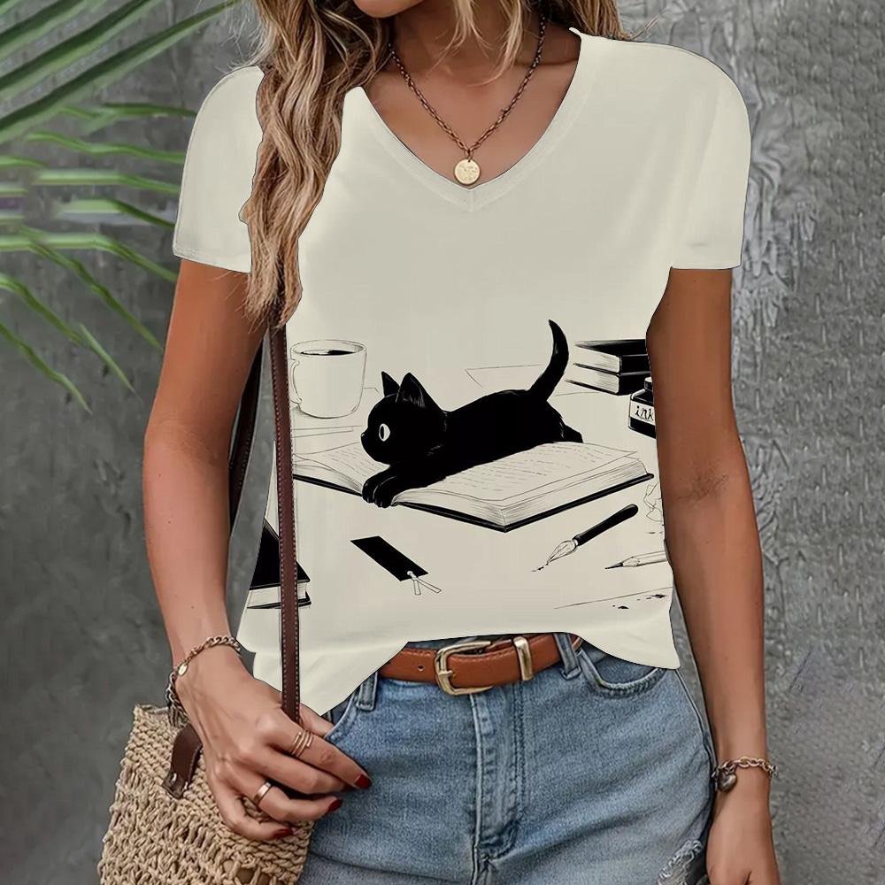 Женская одежда Футболка Новая V-образная горловина с коротким рукавом и рисунком кошки Модный топ Летняя свободная и дышащая одежда Женская футболка