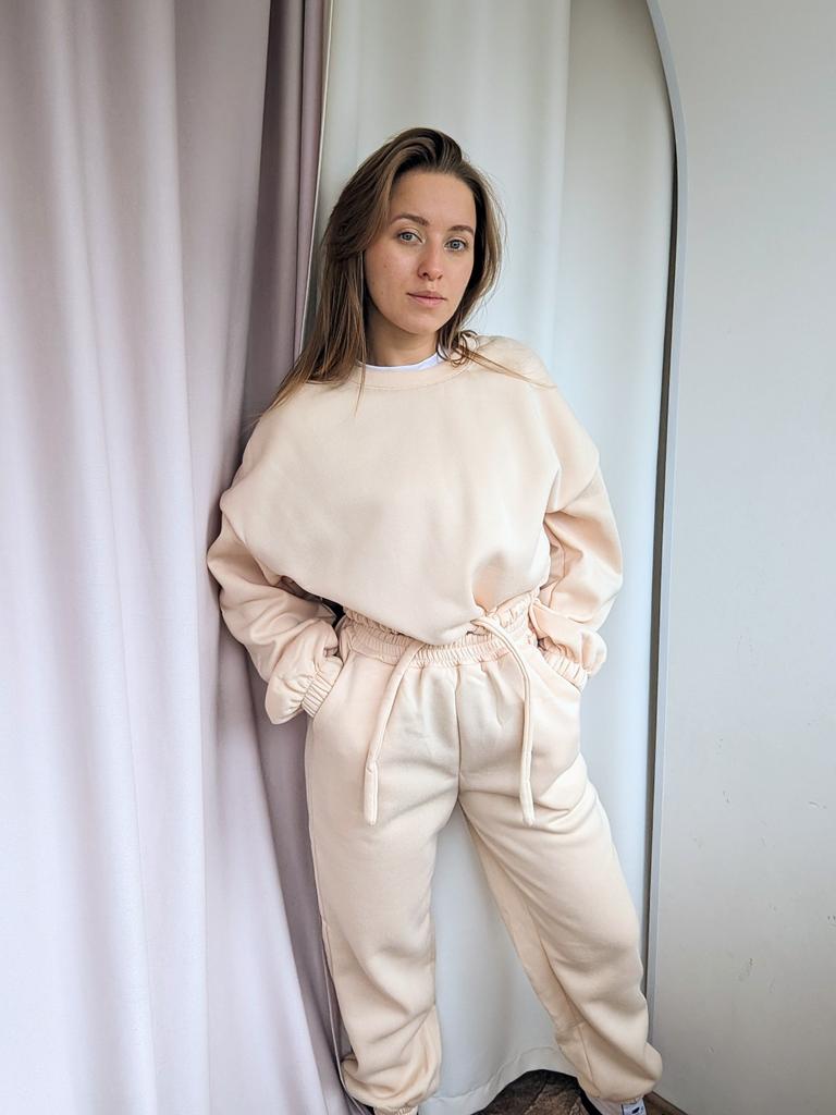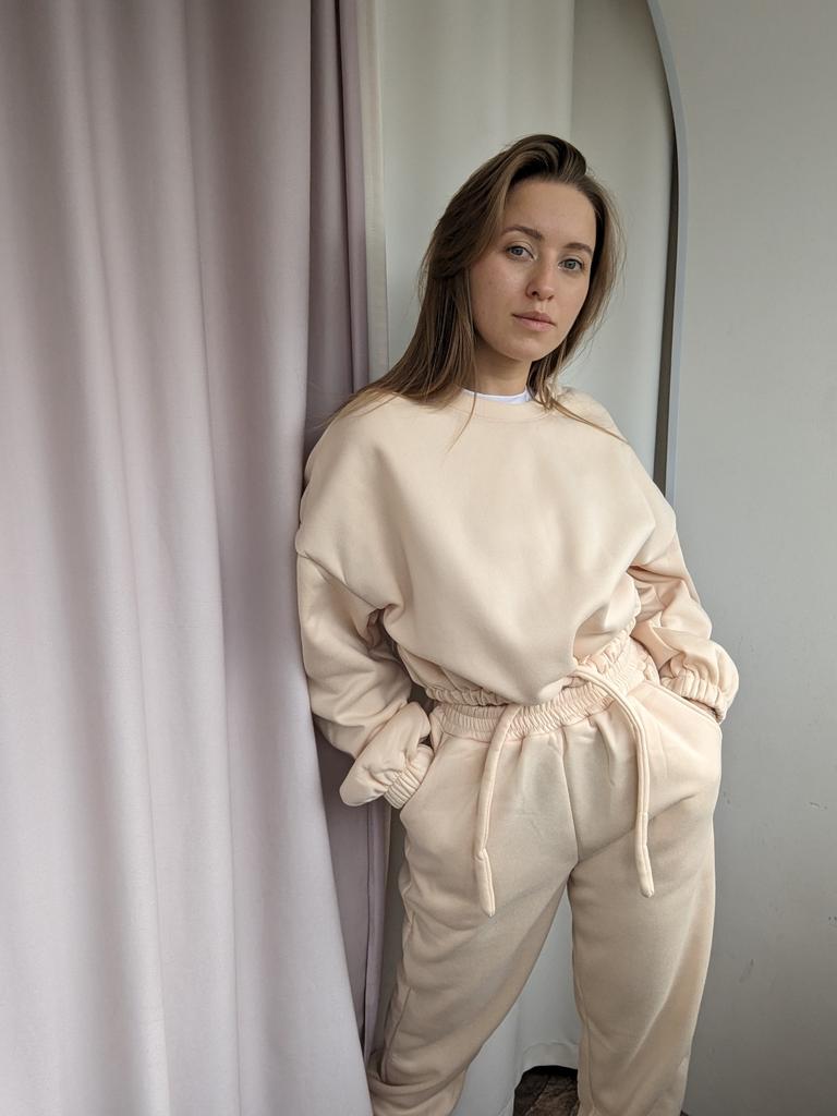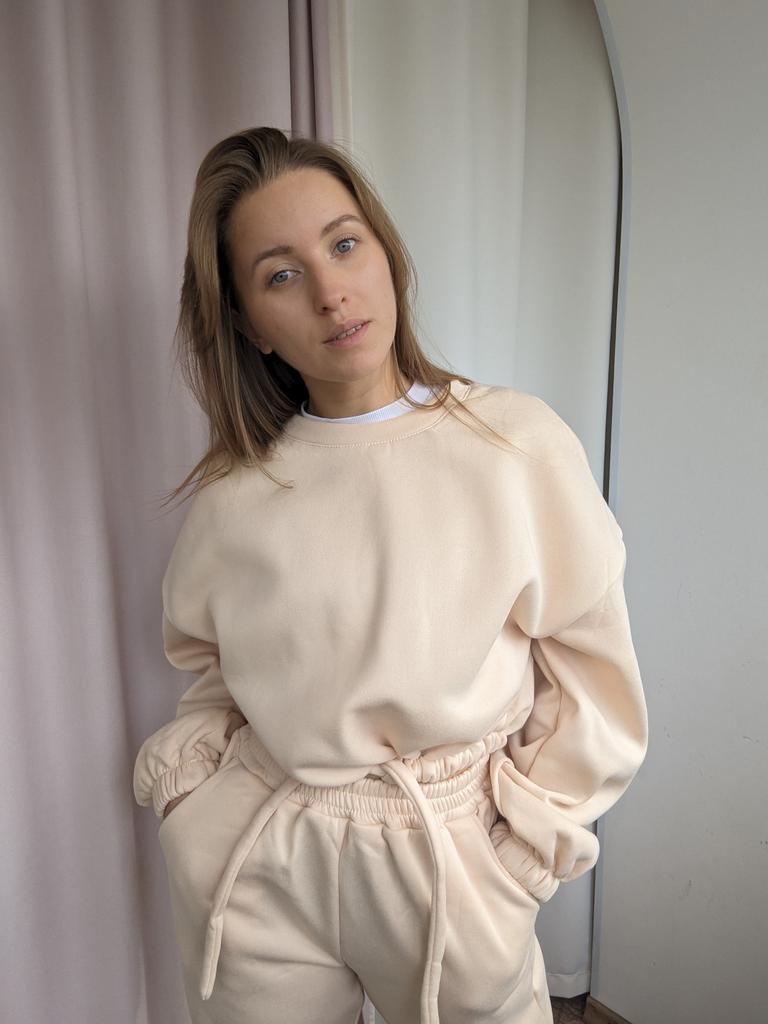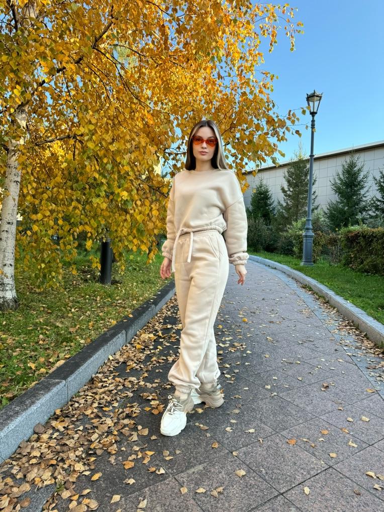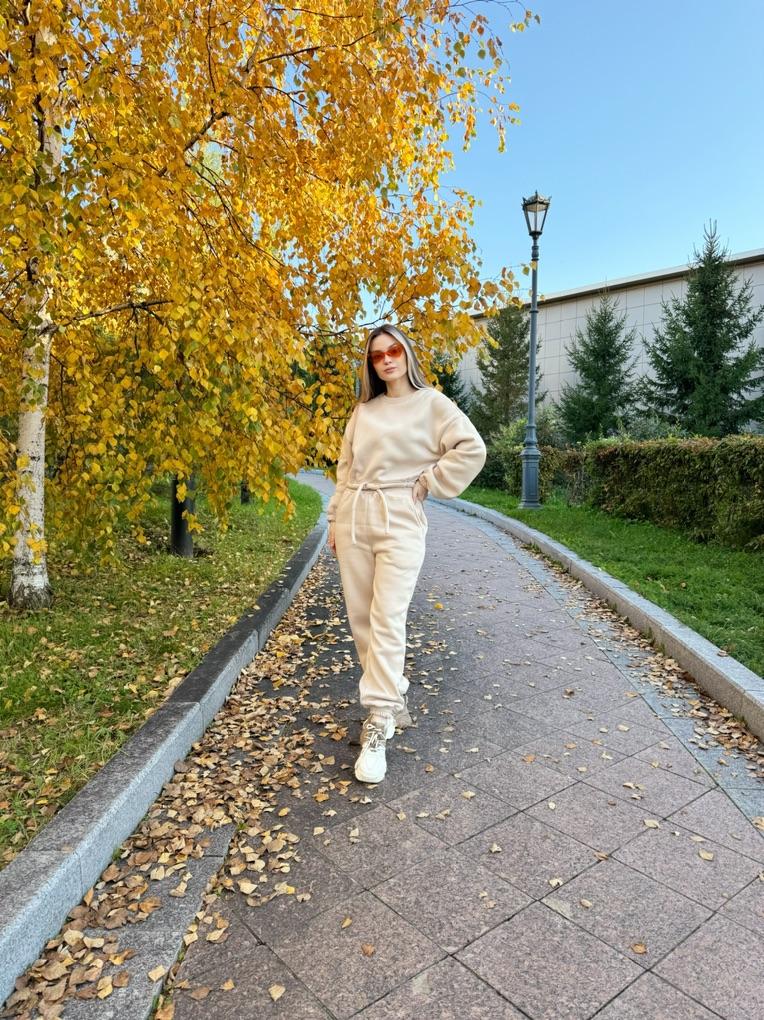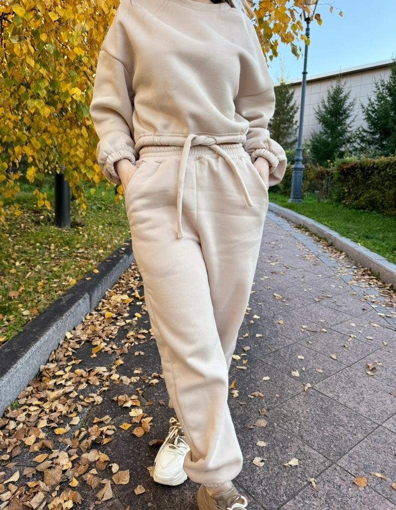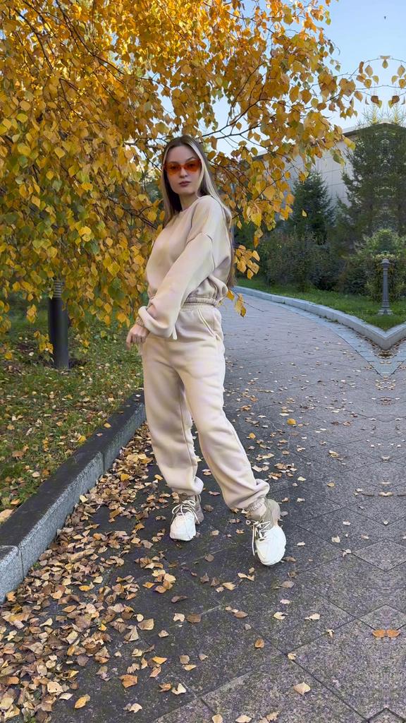 КОСТЮМ😊с укороченной толстовкой Не сильно мнется, после первой стирки не сел и не скатался Размерная сетка у продавца верная, поэтому можете смело по ней ориентироваться. Я взяла себе на 2 размера больше, ТК костюмы маломерят Верх супер, но штаны в резинке велики немного Мои параметры 📏Рост 161 📏ОГ 88 📏Объем под грудью 73см 📏ОТ 67 📏ОБ 96см 📏Вес 56кг 📏Ширина плеч 42 см 📏Длина руки до кисти 60 см 📏Охват бедра 54см На мне размер L. Абрикосовый цвет. Цвета и размеры в ассортименте 🎀 Покупка вышла мне 1870р, но у некоторых выходит купить его уже дешевле со скидками) Сам костюм очень плотный, теплый и объемный. Толстовка с манжетами и шнурком на талии Штаны в размере L, в резинке большеваты, нужно будет ушить, в объёмах идеально. Резинка на штанах плотная. Манжеты на ножках тоже. На штанах 2 кармана. У штанов ПОЛНАЯ длина. Что не мало важно в таких вещах. На мой рост идеально. Сшито все на совесть, нитки не торчат, строчки ровные. Стоит однозначно своих денег. К покупке рекомендую, девчат♥️♥️♥️ Я его уже успела выгулять на дачу, на шашлыки и просто прогулку с детьми. В нем очень тепло🔥