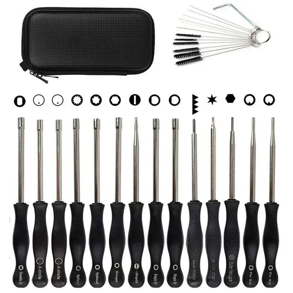 Изготовлен из высококачественной и долговечной нержавеющей стали, эргономичная рукоятка и металлический стержень. Противоскользящая ручка позволяет использовать его более стабильно и точно, поставляется с сумкой для переноски, чтобы защитить инструменты, а также чтобы все отвертки не разлетались, легко иметь все 14 инструментов организованными на месте,