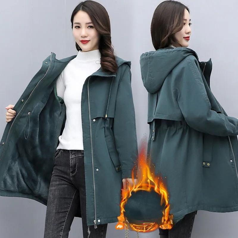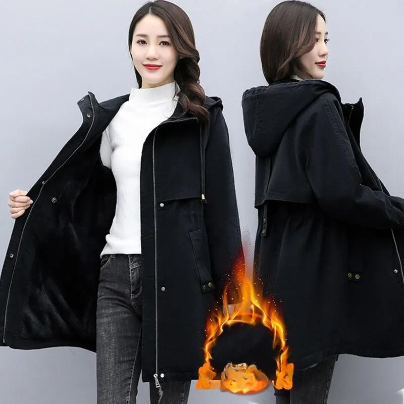 Парки женские осенне-зимние шерстяные подкладки утолщенные теплые длинные пальто корейские свободные ветровки с капюшоном женские хлопковые набивные пальто