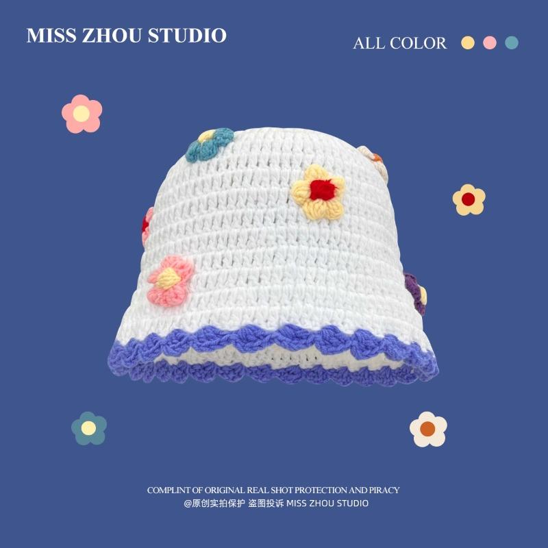 Japanese Sweet Flower Knitted Bucket Hats for Women Autumn and Winter Warm Cute Show Face Small Versatile Retro Basin Caps