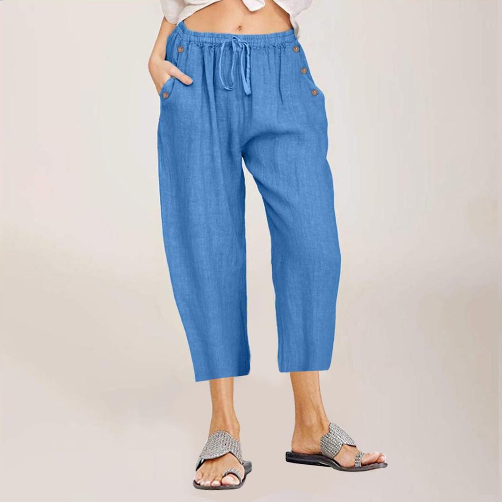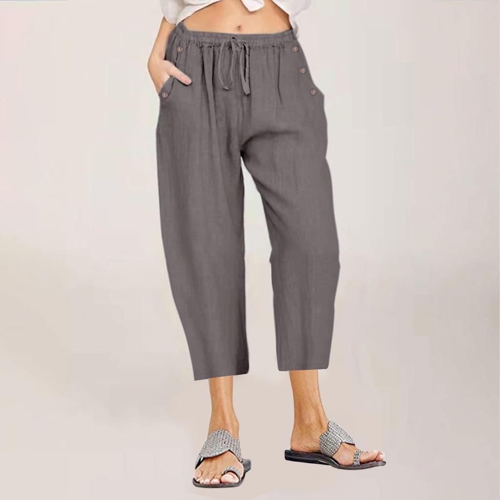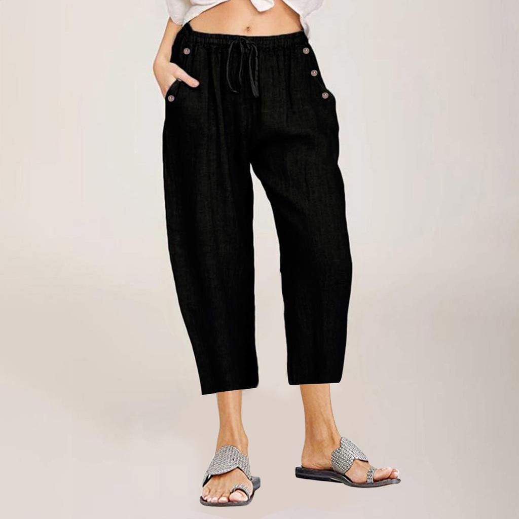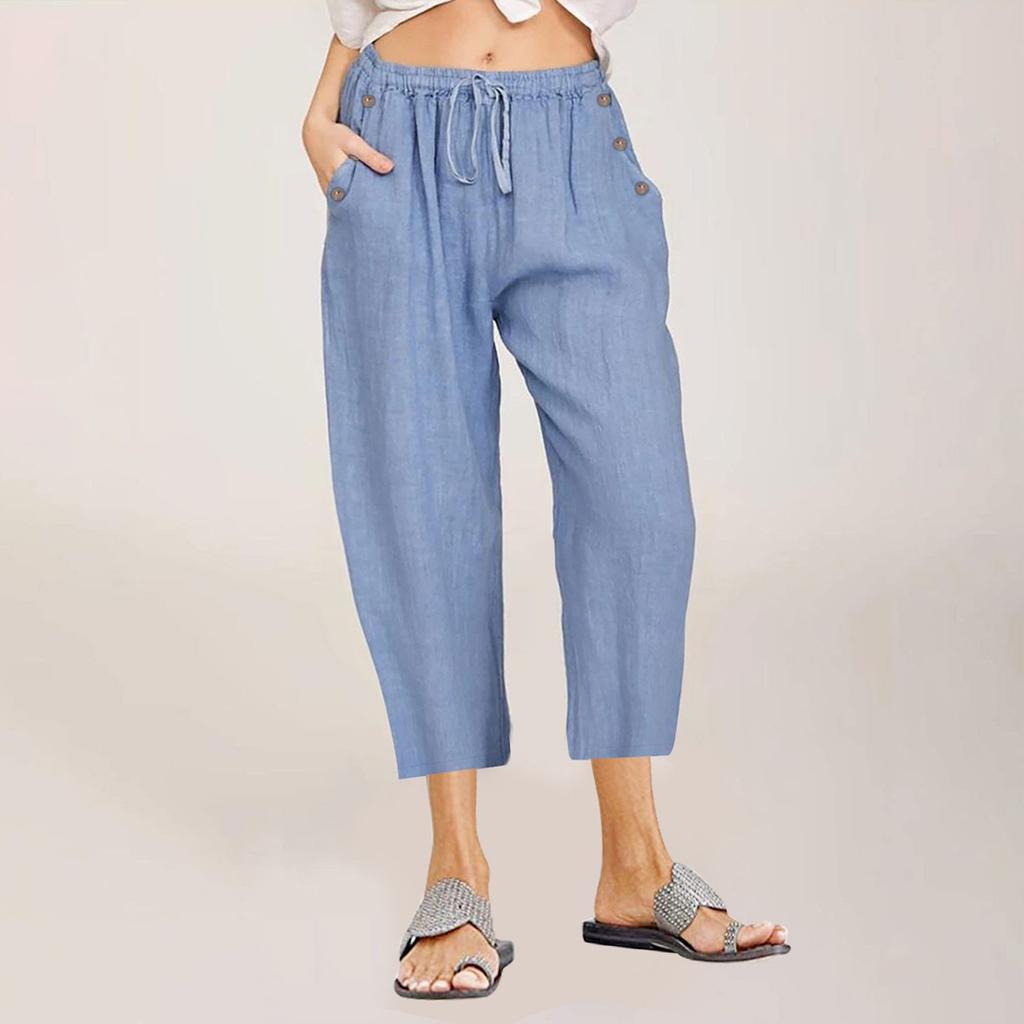 Женские капри, летние хлопковые и льняные широкие повседневные капри с высокой талией и карманами на шнуровке, брюки в стиле бохо для женщин