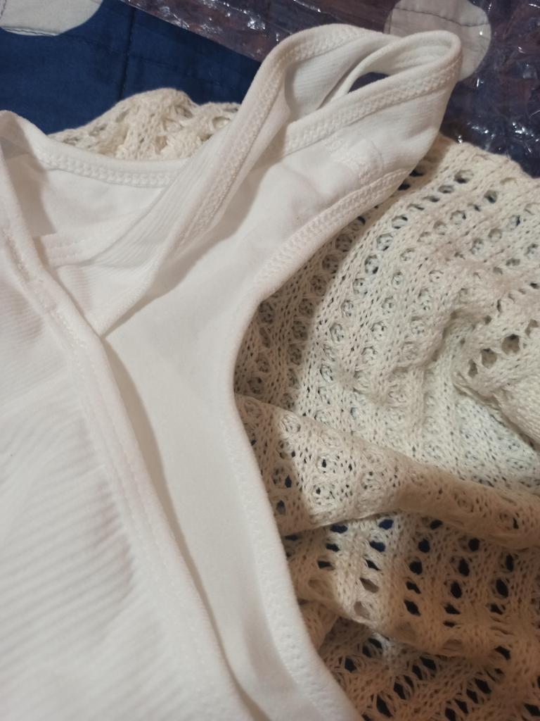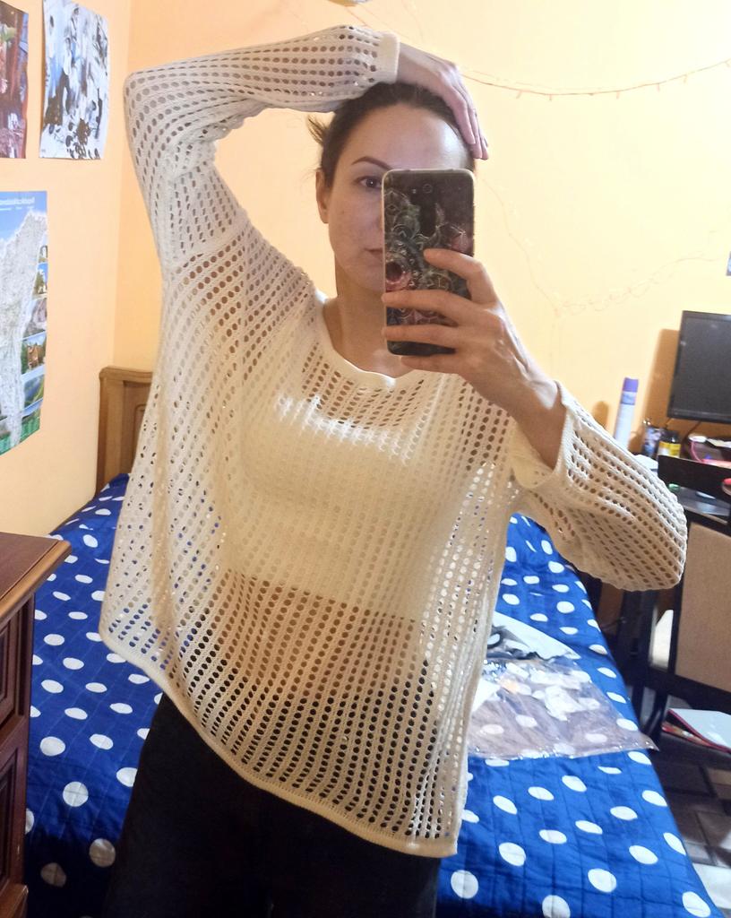 Замеры в описании, конечно, от балды, но на мне село идеально. Замеры моей кофты: плечи - 62, по груди - 60, длина - 58, рукав - 45 Я: рост 168, вес 56, 90-76-96 Цвет кофты не белоснежный, больше в сторону топлёного молока. Материал мягкий, не колючий, не мнется и легко не растянется. На жару все-равно не жарко, хорошо проветривается. Сережки в подарок положили. Всё лучше, чем я ожидала, хоть и не так, как представлялось по фото и описанию. спасибо!