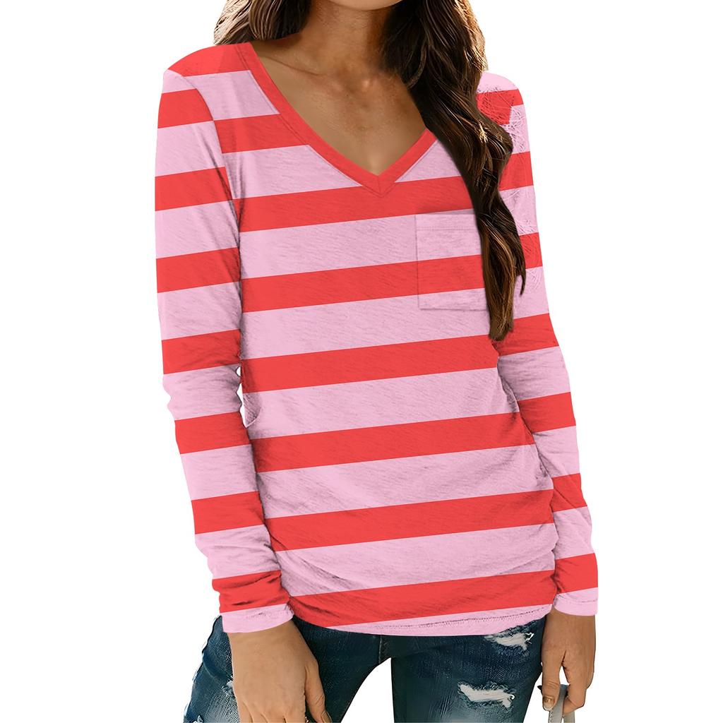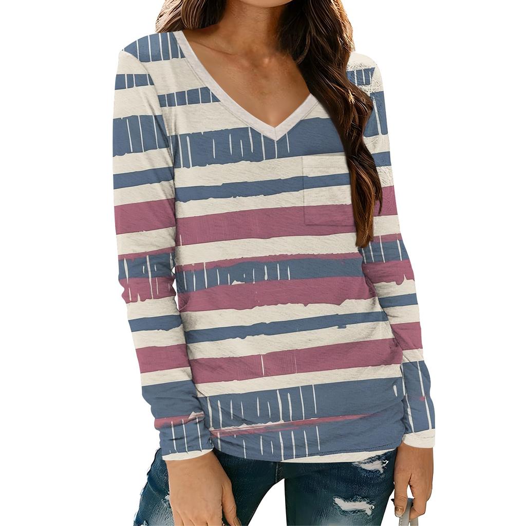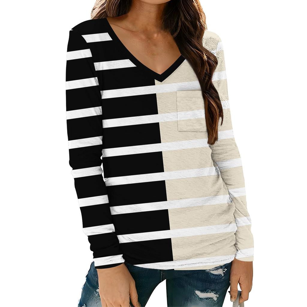 Женская модная повседневная футболка с длинным рукавом и V-образным вырезом в полоску с принтом и карманом
