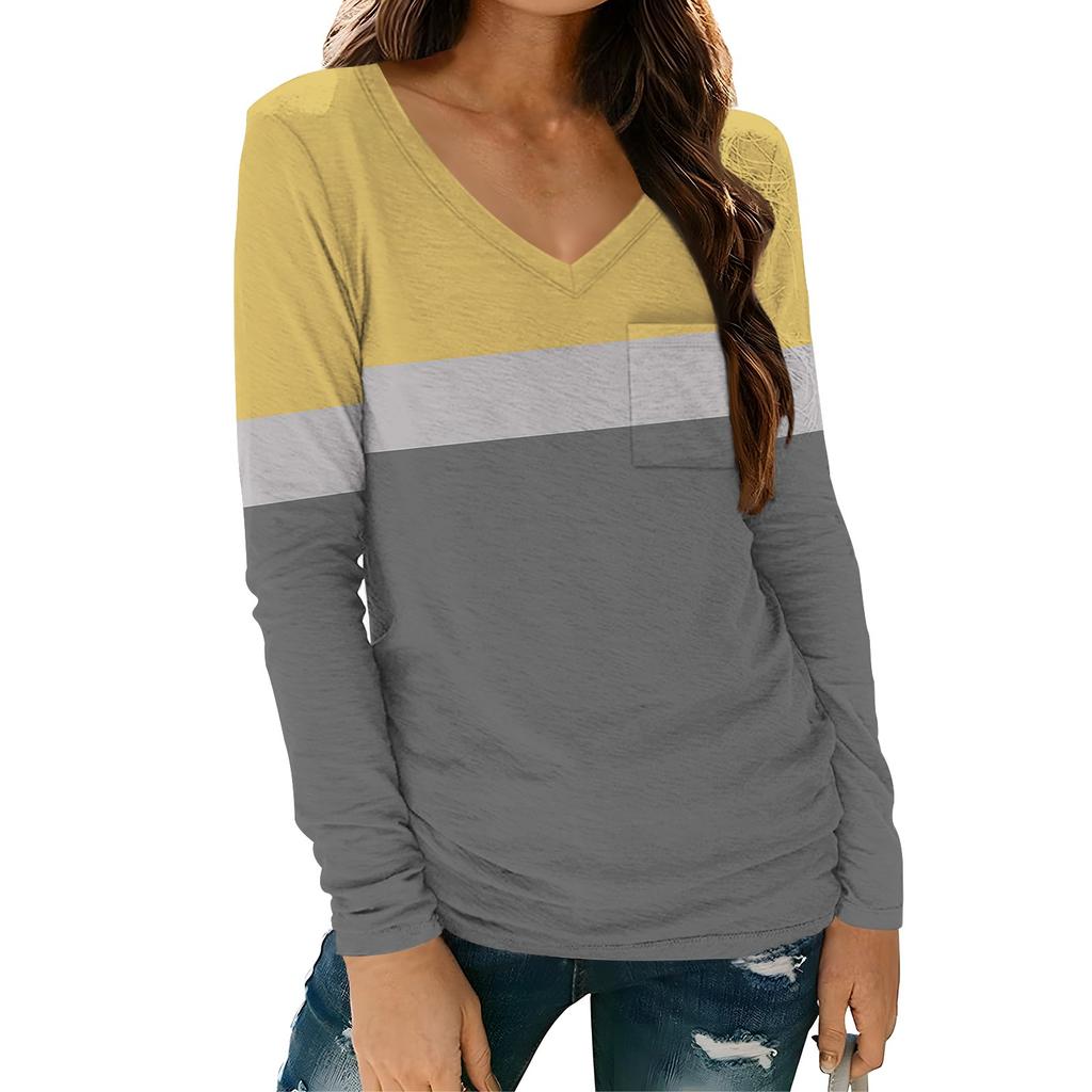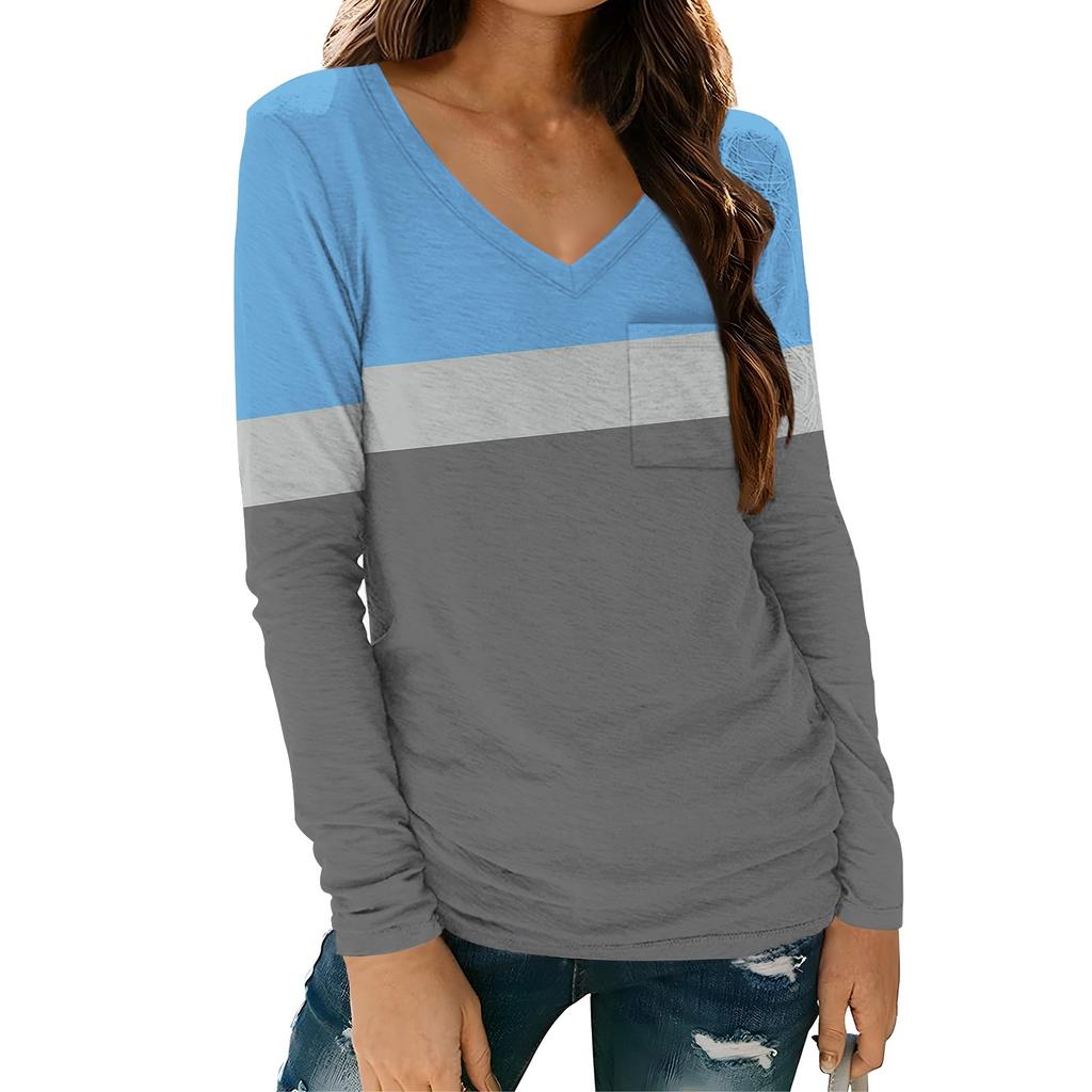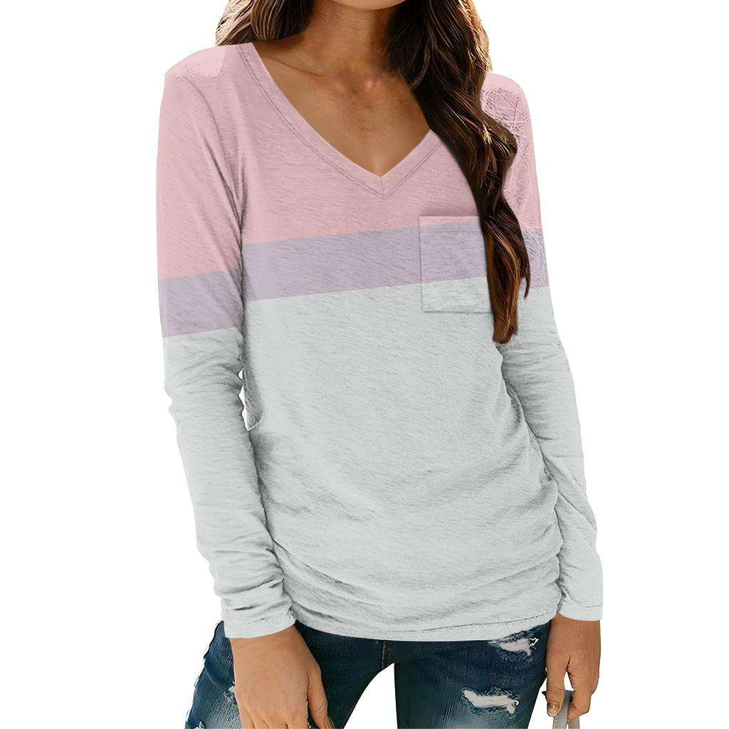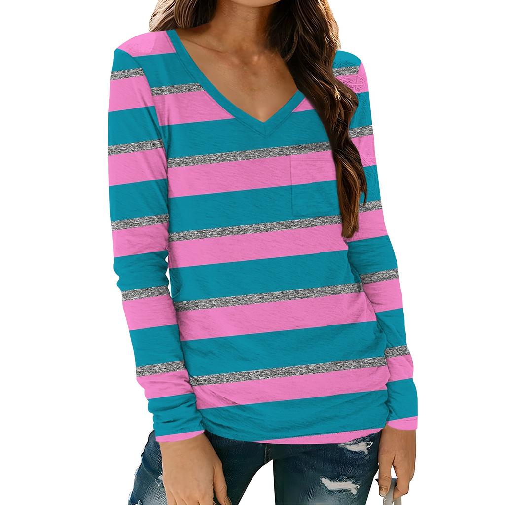 Женская модная повседневная футболка с длинным рукавом и V-образным вырезом в полоску с принтом и карманом