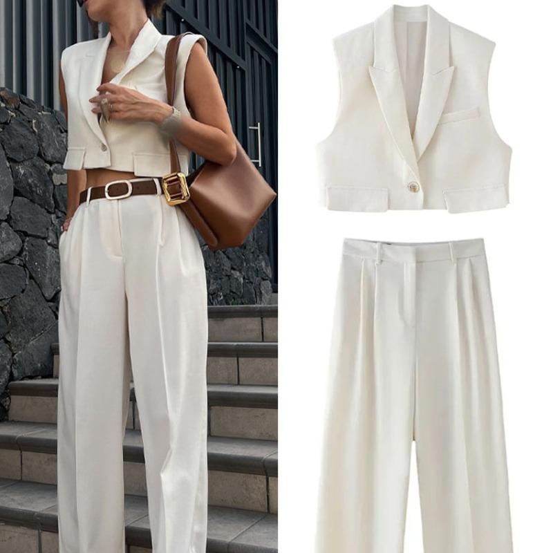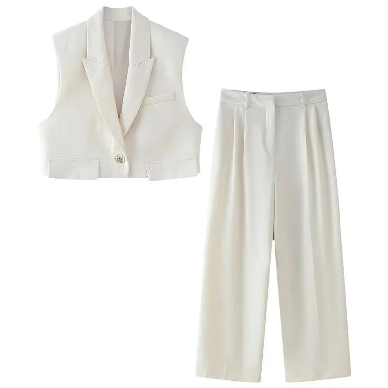 Летний комплект брюк для женщин с лацканами, короткий жилет без рукавов, шикарный элегантный формальный стиль, женские широкие длинные брюки