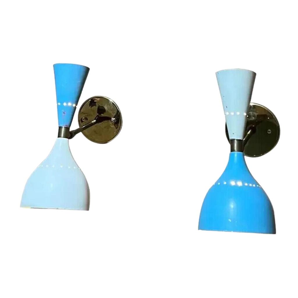 Сенсационное настенное бра Stilnovo 1950-х годов, двойной конус, сине-белый + латунь, Ital — купить товар онлайн с бесплатной доставкой по всему миру!