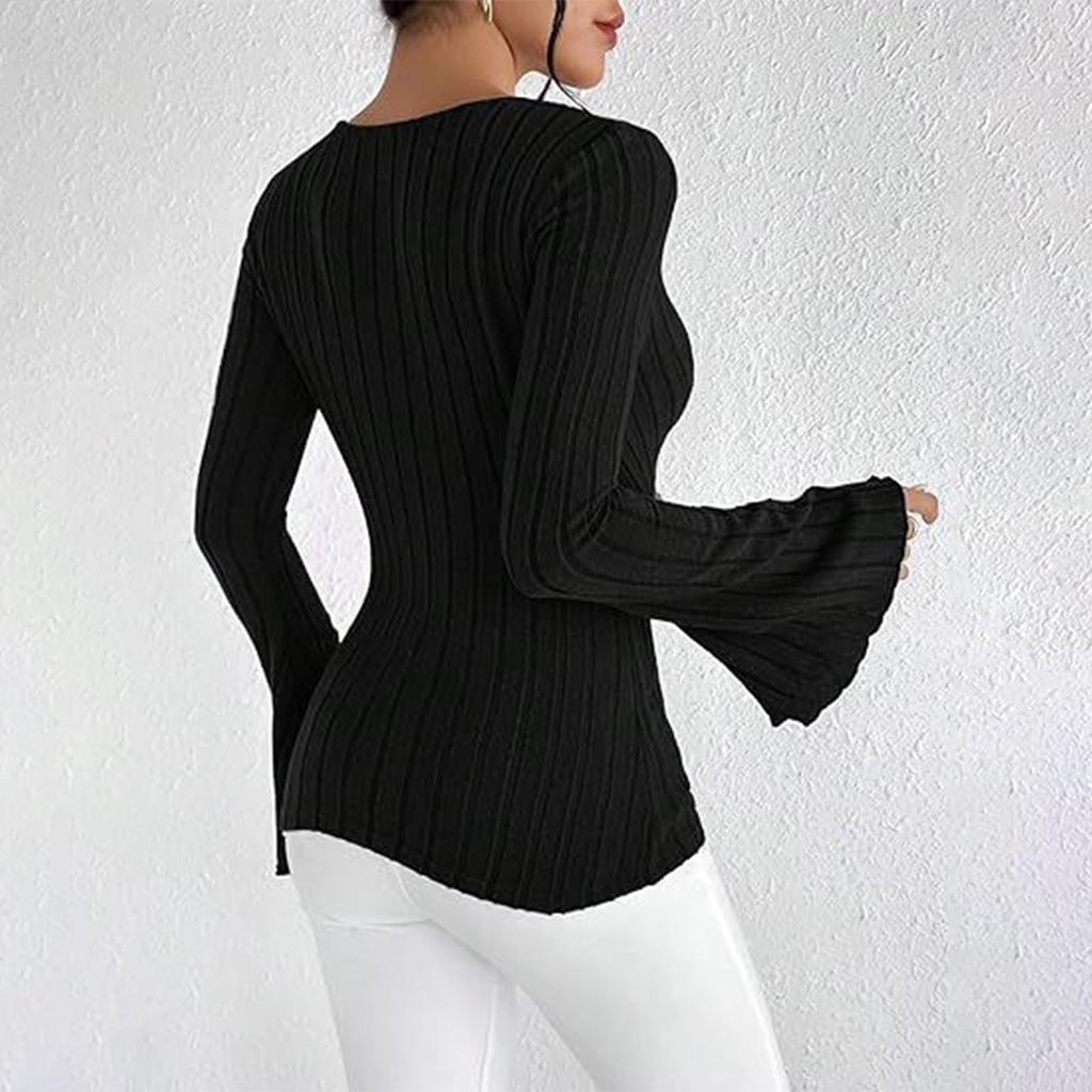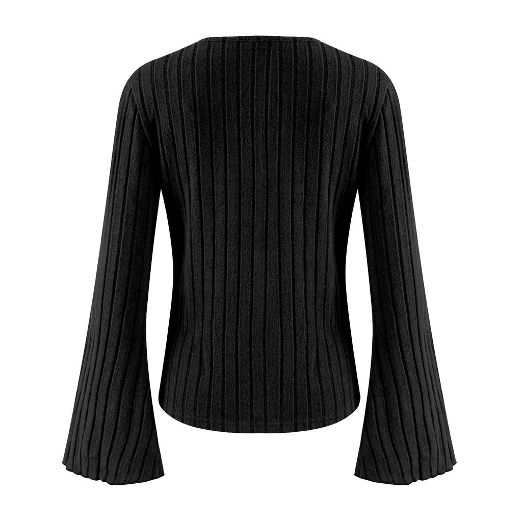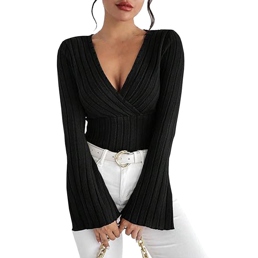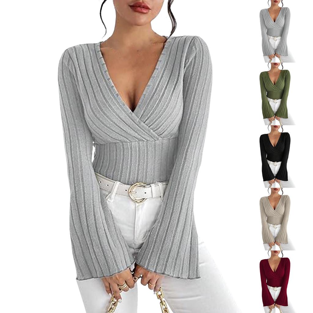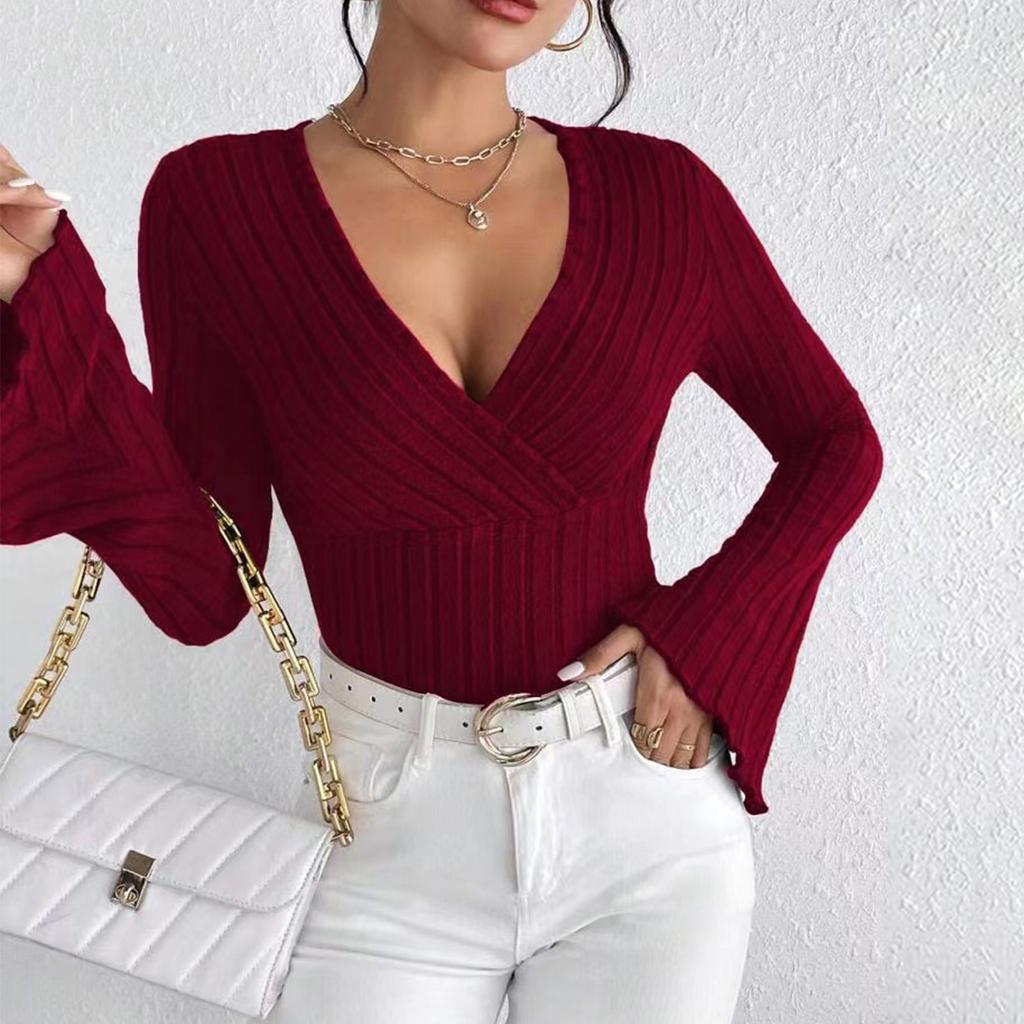 Женская мода осень и зима ребристые однотонные V-образный вырез тонкие длинные рукава футболки топы