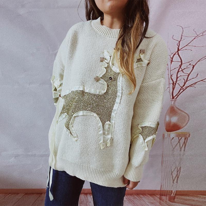 Новый осенне-зимний рождественский свитер для женщин с жаккардовым узором в виде оленя с золотой нитью и круглым вырезом, толстый трикотажный пуловер