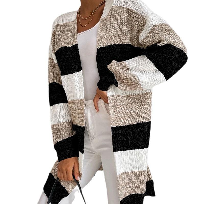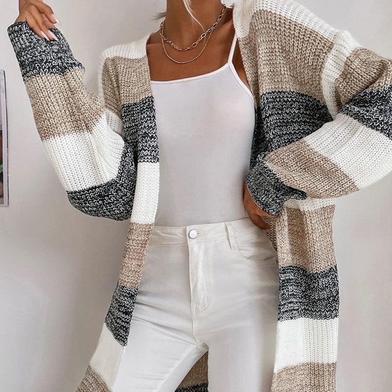 Женский осенне-зимний свободный полосатый кардиган контрастного цвета с длинными рукавами, вязаный свитер