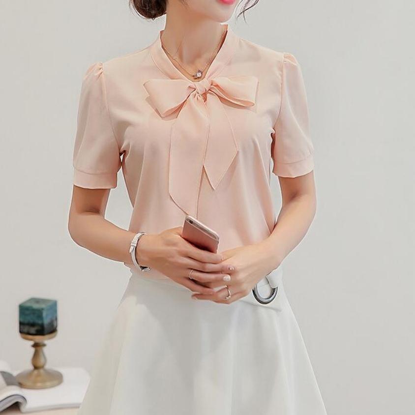 Летняя женская розовая белая шифоновая блузка, модная корейская рубашка с воротником-бабочкой, повседневная офисная рубашка с коротким рукавом, базовый топ