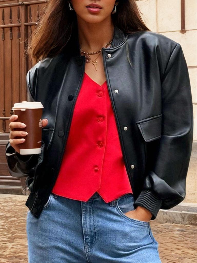 Rose Beauty A Street пряжка передний клапан карманы бейсбольный воротник свободный искусственная кожа повседневная мотоциклетная куртка пальто для женщин