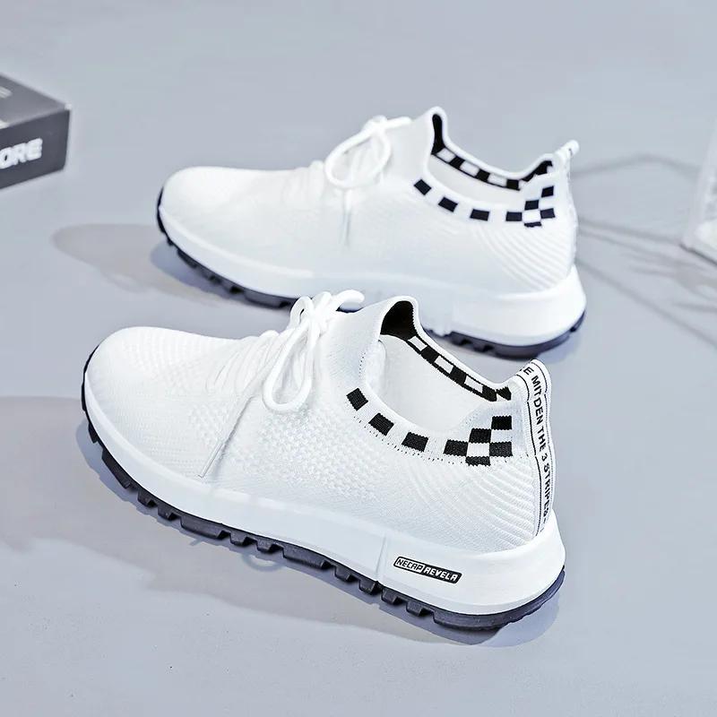 Женские новые белые кроссовки, модные дышащие спортивные сетчатые универсальные прогулочные летающие тканые нескользящие женские кроссовки Zapatos Mujer