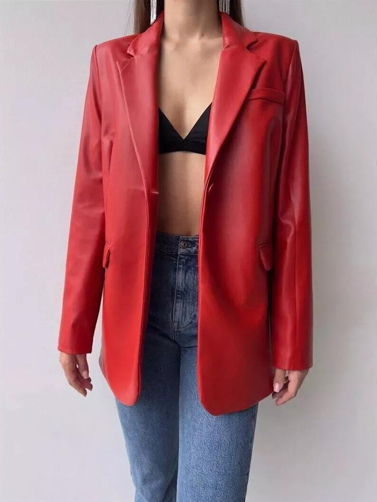 AL KHALID Красный Настоящий Натуральный Ягненок Женский Классический Стильный Пиджак На Пуговицах Кожа