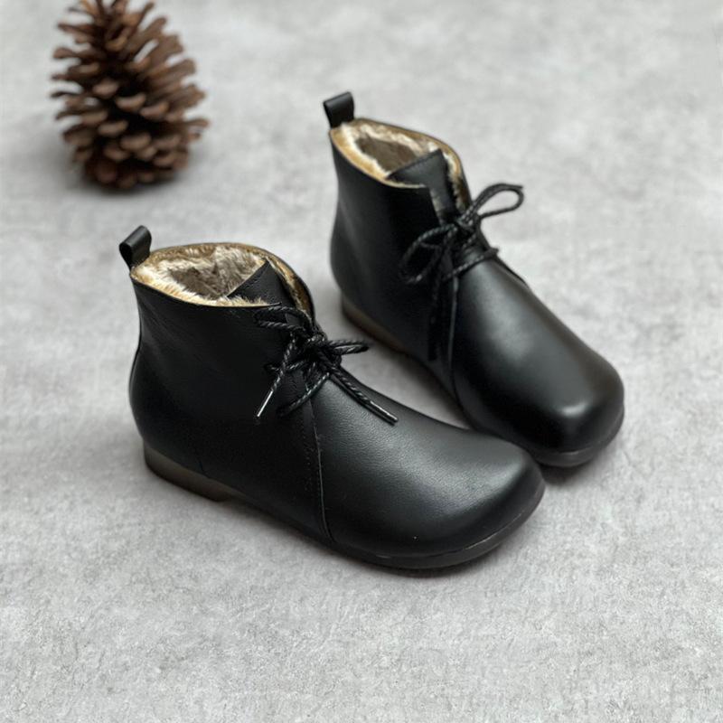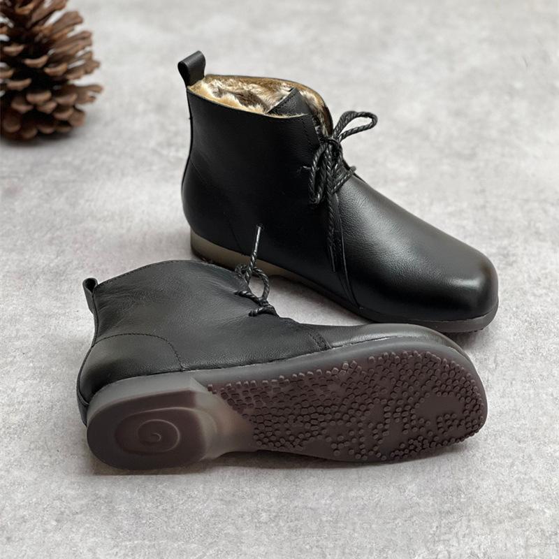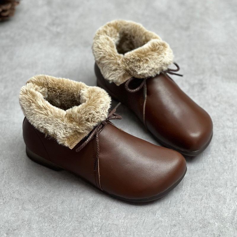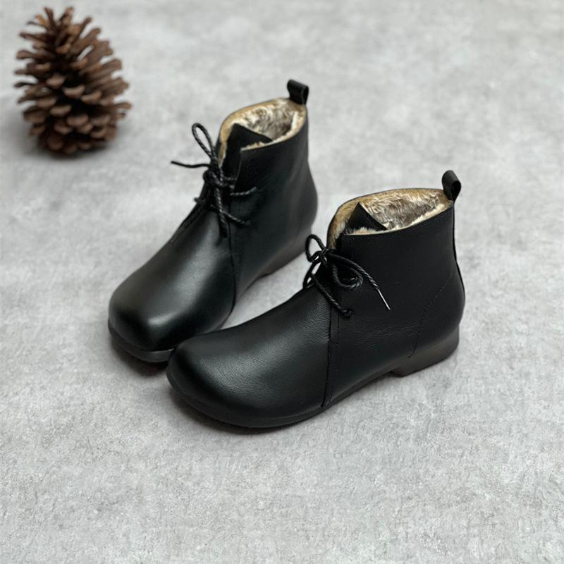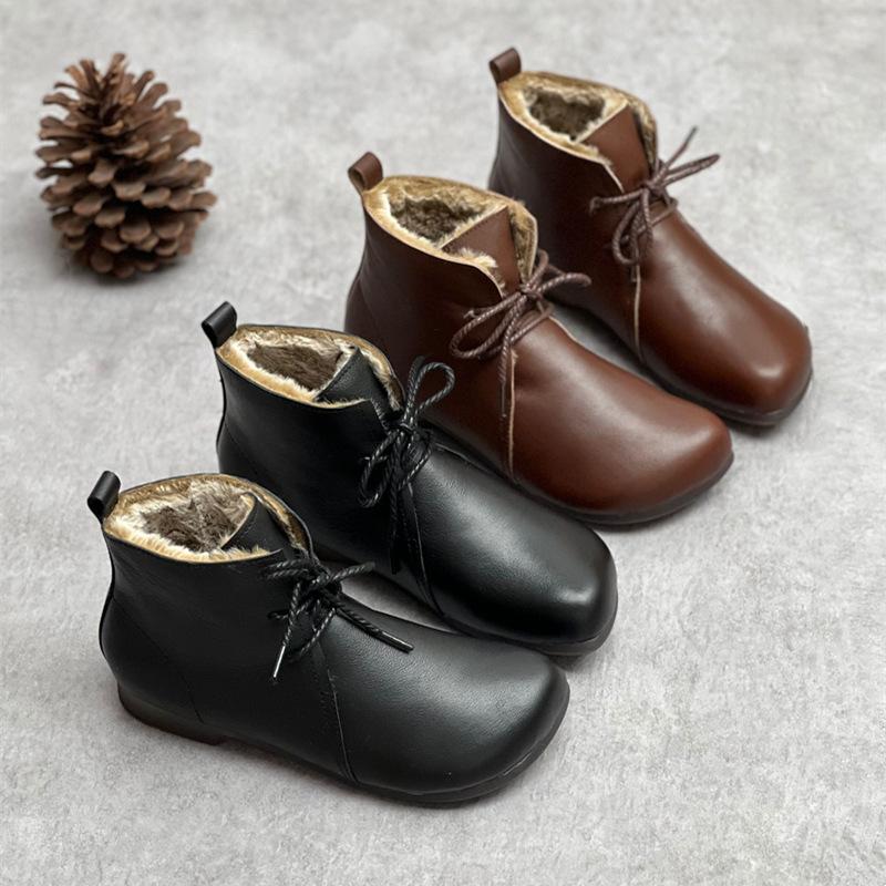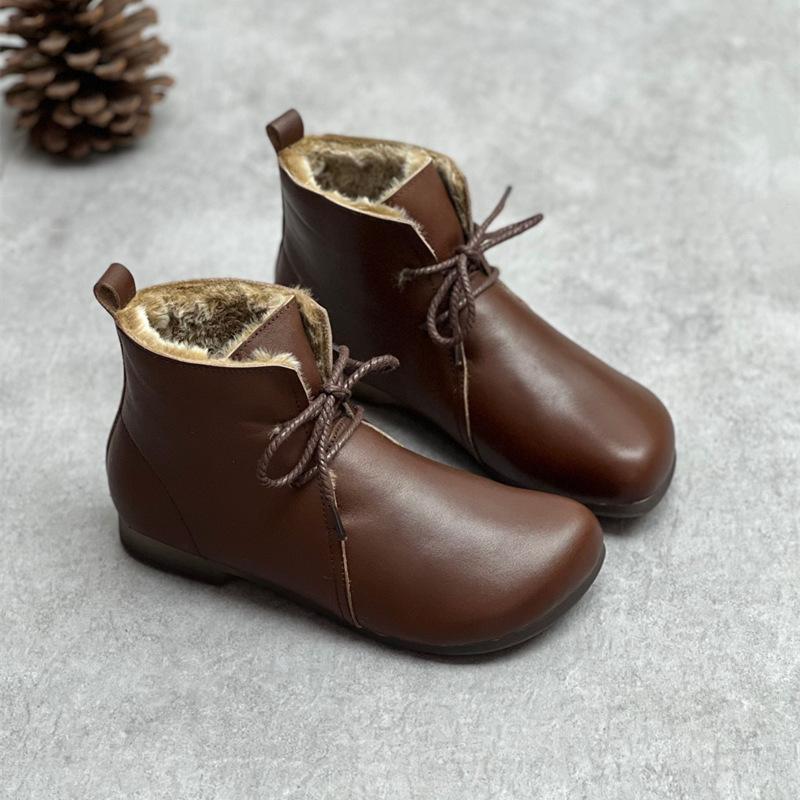 Johnature Винтажные женские туфли ручной работы из натуральной кожи с круглым носком, плюшевые теплые короткие ботинки на шнуровке