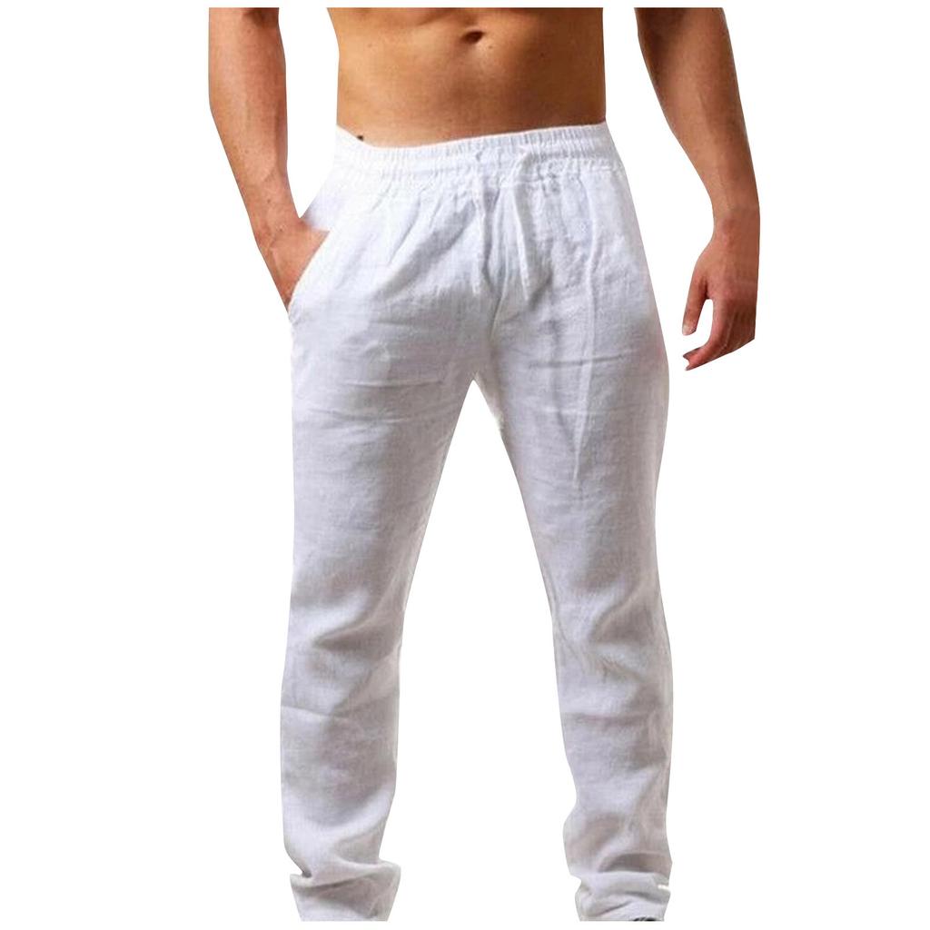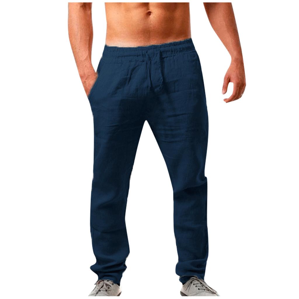 Мужские свободные повседневные однотонные хлопковые льняные брюки с эластичной завязкой, прямые брюки
