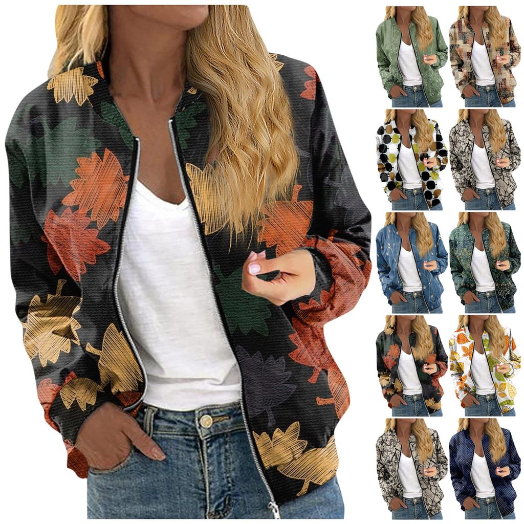 Куртки для женщин, легкие укороченные куртки с длинным рукавом на молнии, модная верхняя одежда с принтом, повседневные стеганые куртки с карманами
