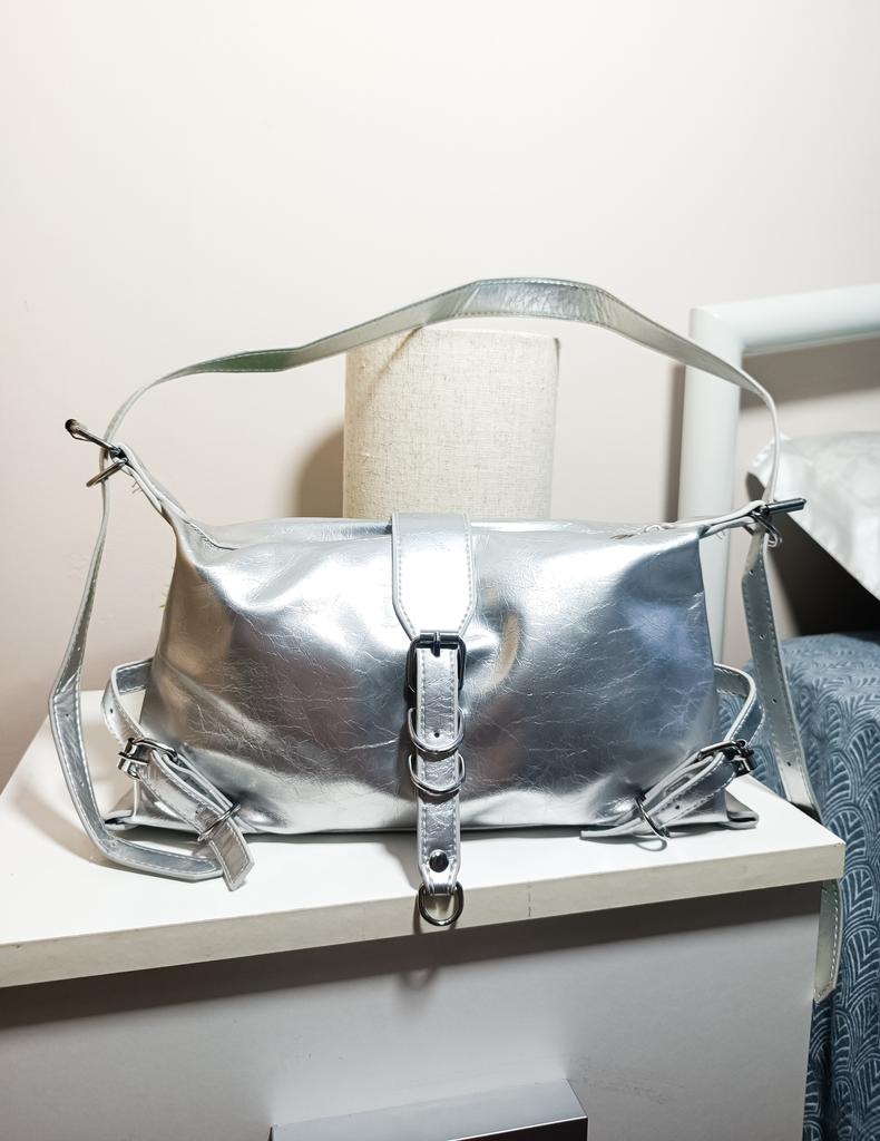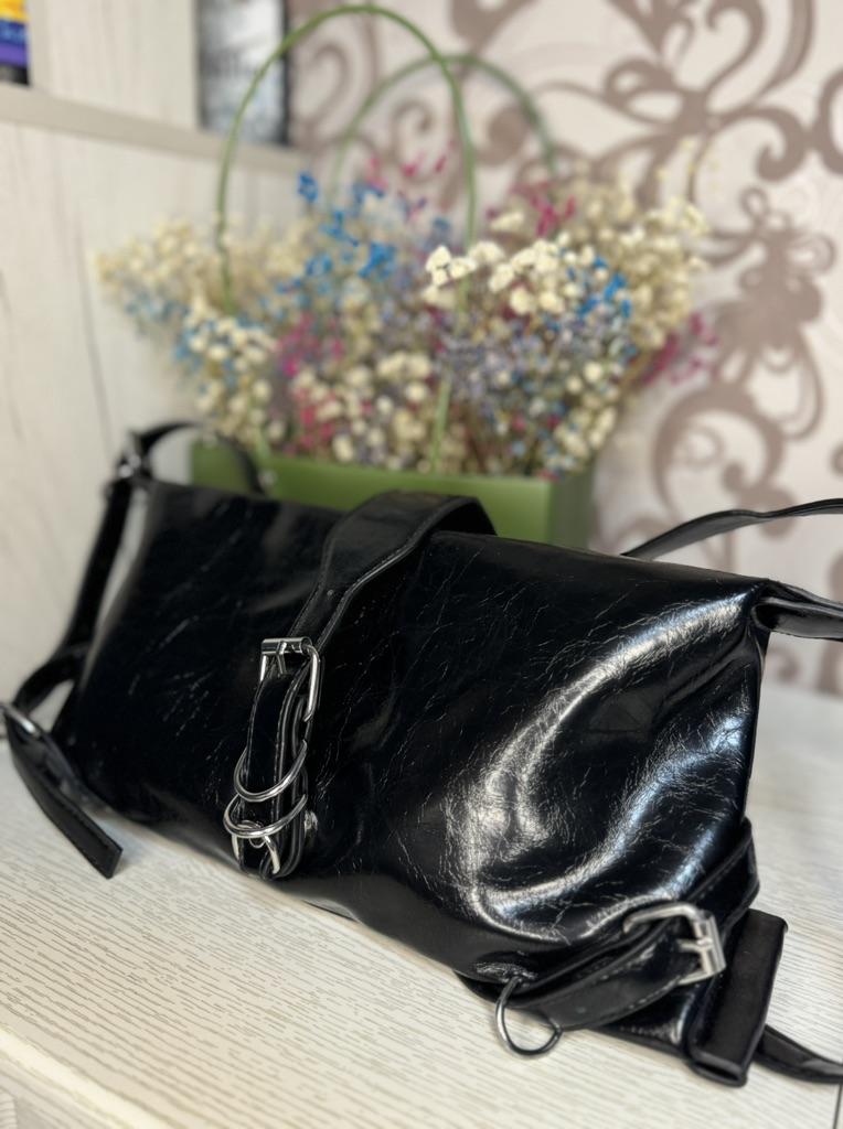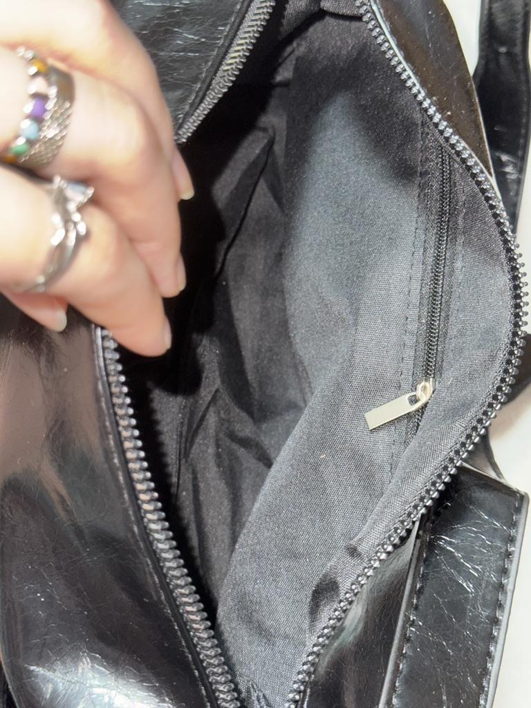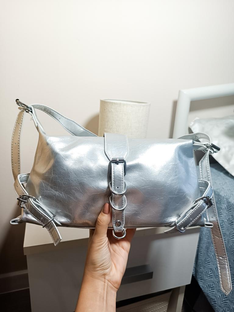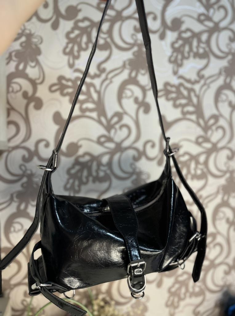 Сумочка y2k, и она ну просто огонь 💅🏻 Очень очень очень понравилась внешне. Не удержалась, заказала, хотя вообще не сказать что часто хожу с чем-то, что не шоппер 🥲 - Мягкий лакированный кожзам. Приятный и гладкий на ощупь, надеюсь что проживет достаточно долго (за счет текстуры «трещинки» думаю, что даже какие-то поношенности будут незаметны); - Сумка сама по себе на замке, внутри есть подкладка и один кармашек на замке; - Уточню, что сверху она закрывается ремешком. И, если что, его не нужно каждый раз расстегивать, так как он идет на клепке; - Длина общего ремешка регулируется. Правда, засунуть язычки некуда; - Вместительная! Туда легко вошли кошелек, телефон, книга (небольшая), ключи и помада. Но войдет и еще несколько разных штучек; - Нужно учесть, что за счет мягкого материала — форму она не держит. Только если ее набить прямо под завязку; - Много металлической фурнитуры, которая придает определенный вайб и стиль. Очень классно выглядит! Все равно крутая. Прям для определенных образов то, что нужно) Теперь еще хочется бордовую 😍