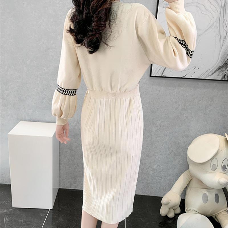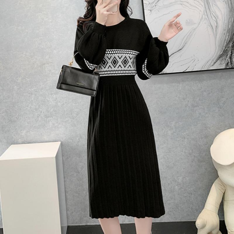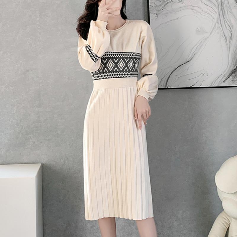 Женская мода осень-весна ромбовидный узор с длинным рукавом и круглым вырезом повседневные платья