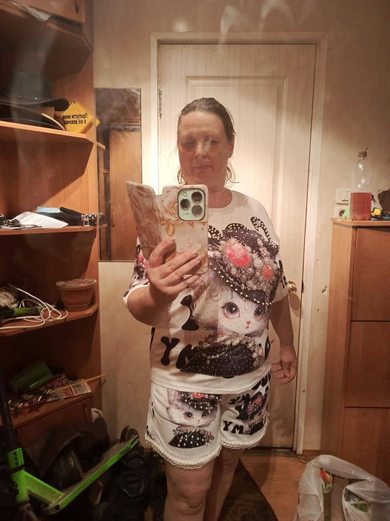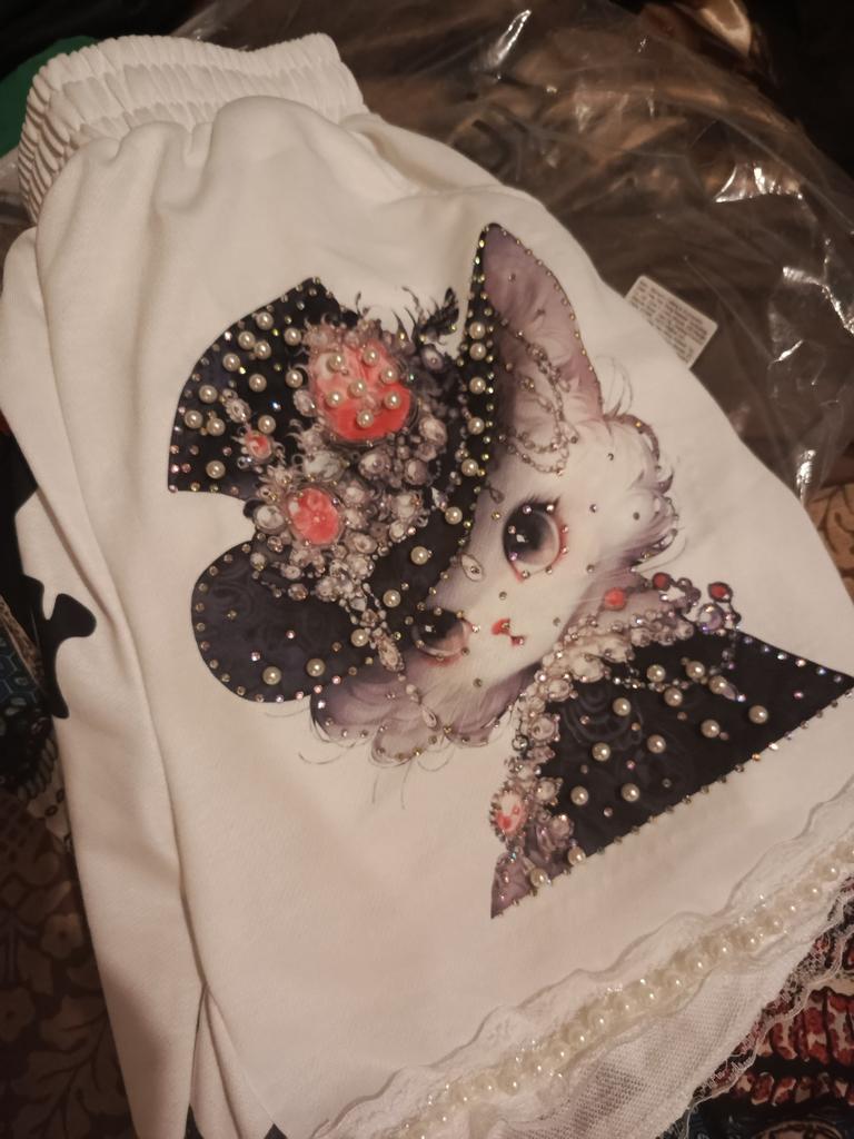 Когда достала был Вау эффект. Все блестит, искрится, футболка синтетика а шорты футер.. Есть запах химии, но это все ничтожно по сравнению с этой красотой. Не знаю правда как эту красоту стирать. Руками наверное. Но. Футболка принт с двух сторон и на рукавах, с перейди бусины, стразы, на шортах тоже на правой части стразы внизу бусины по всему периметру. Размер. Футболка оверсайз, подойдет размера до 56 точно, как и шорты так как шорты трикотаж футер , слава богу одна нитка.мои размеры Ог 108 От 95 ОБ 115 Сидит свободно