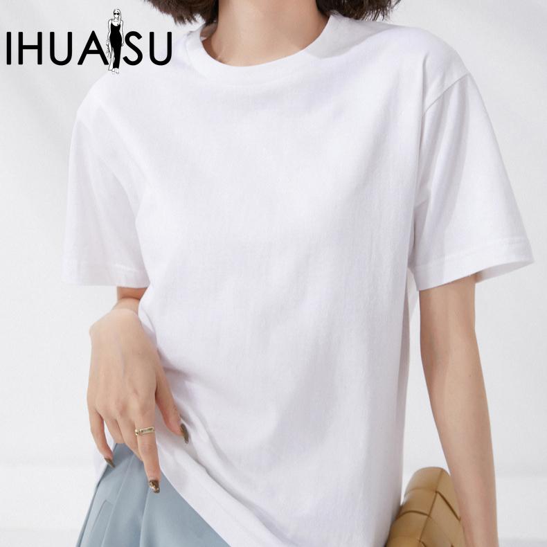 IHUASU Однотонная футболка с короткими рукавами, весна-лето, женская свободная хлопковая рубашка с коротким рукавом и о-образным вырезом, тонкий топ