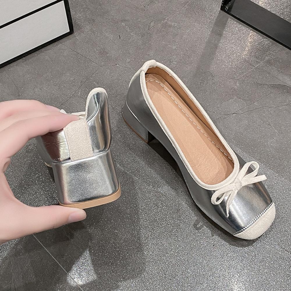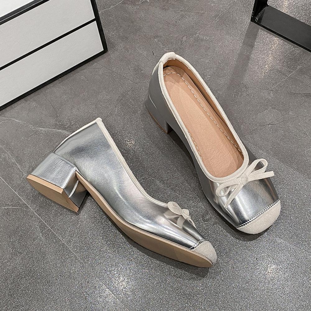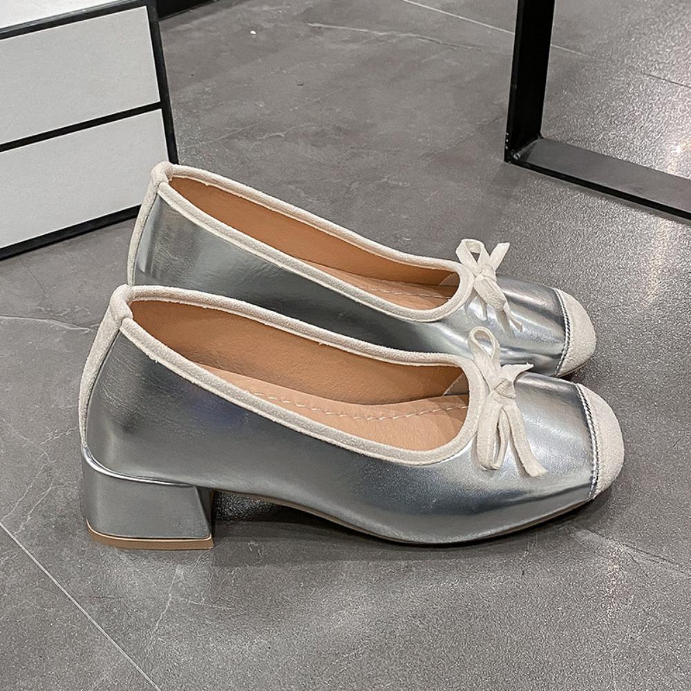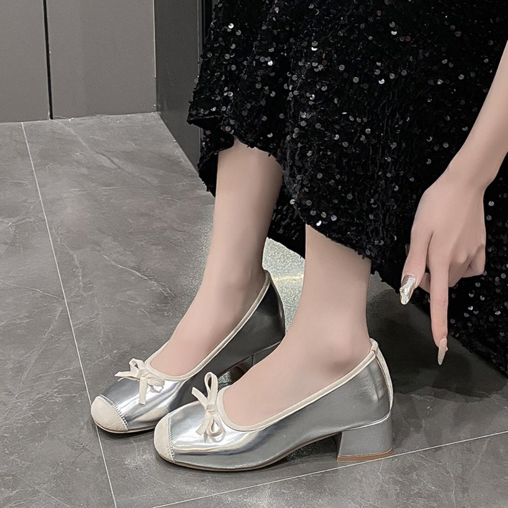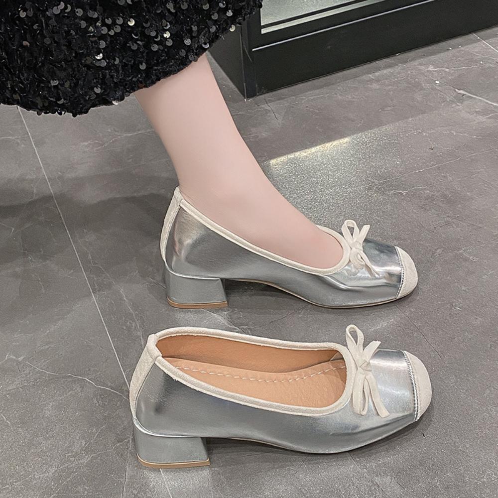 Балетки Удобные французские туфли на толстом каблуке среднего размера с квадратным носком Модные туфли с бантом
