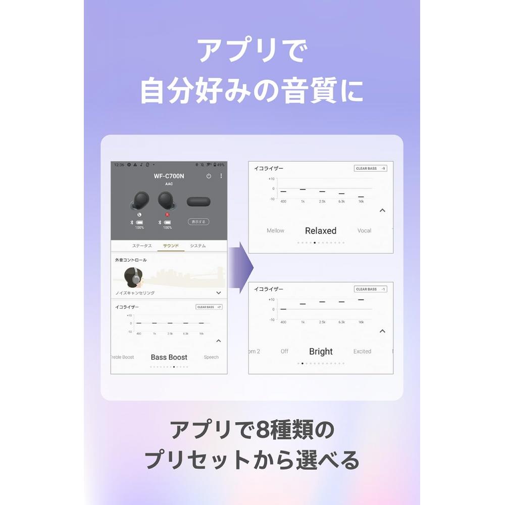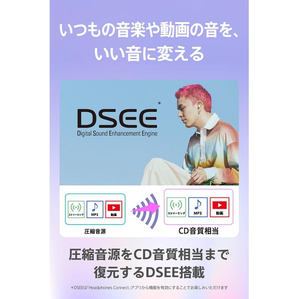 Соотношение высоких и низких частот хорошее, и вы можете наслаждаться естественным и чистым звучанием голоса и звучанием музыки.. Кроме того, фирменная технология Sony [DSEE] () дополняет высокий диапазон, который легко пропустить из-за сжатого источника звука, в наушниках до такого же качества звука, как на CD. Источники звука, сжатые с помощью потокового воспроизведения, MP3 или кодеков передачи по Bluetooth, воспроизводятся с хорошим, рассеянным звуком.. Вы можете насладиться DSEE, активировав функцию в приложении «Headphones Connect».