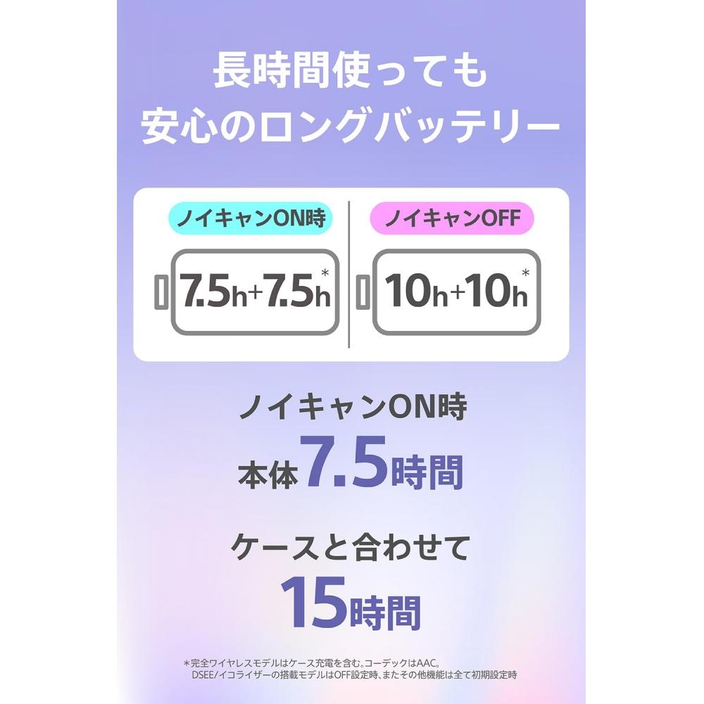 «При включенной функции шумоподавления консоль можно использовать до 7,5 часов и до 15 часов (1) всего, включая зарядку кейса. Также он совместим с быстрой зарядкой. (2), на котором можно играть в течение 60 минут после 10-минутной зарядки. Он также оснащен водонепроницаемым корпусом IPX4. (3), поэтому его можно использовать без проблем даже во время дождя или в непогоду.1 Полностью беспроводная модель включает в себя зарядный чехол. Все остальные функции также обеспечивают защиту функций основного блока от падений с исходных настроек.