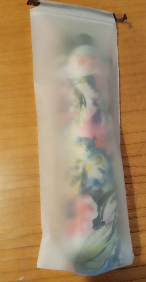 Широкий, плотный чехол. Вещь необходимая, так как мокрый зонт держать в руках(в автобусе, магазине, авто и т. д) не очень удобно. Продавца благодарю👍