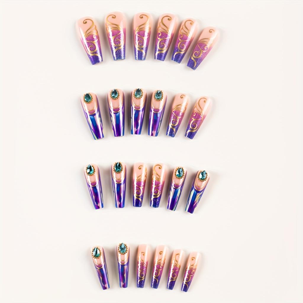 24 шт. глянцевые длинные накладные ногти балерины, фиолетовый градиентный пресс на ногтях с музыкальными нотами и зелеными стразами