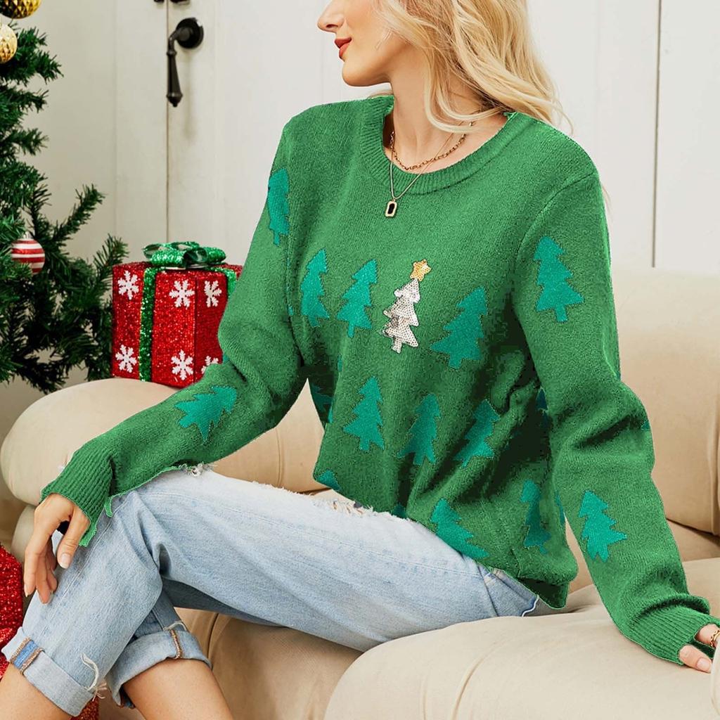 Женский рождественский свитер, пуловер с длинными рукавами, рождественская елка, узор снежинки, рождественский вязаный свитер с круглым вырезом, топ